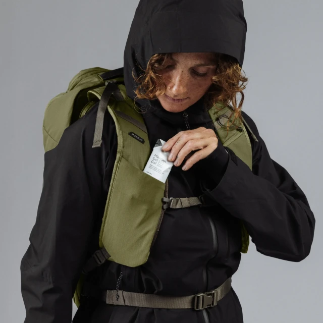 Das LightWeave™ Ripstop-Material mit doppelter PFAS-freier DWR-Beschichtung bietet wasserabweisenden Schutz. Eine magnetische Klappe leitet Wasser vom Frontreißverschluss ab und reduziert so das Eindringen von Wasser bei starkem Regen.