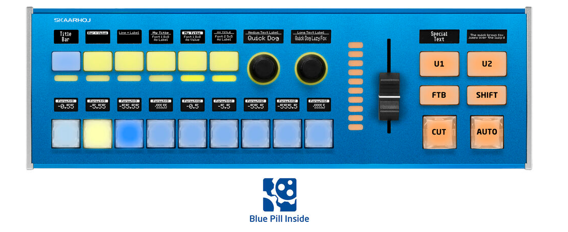 Ein integrierter ME-Bereich (Mix Effects) umfasst mehrstufige Shift- und User-Tasten, die eine erweiterte Steuerung komplexer Umschaltabläufe ermöglichen. Mit „Blue Pill Inside“ integriert das Gerät die leistungsstarke Verarbeitungshardware von SKAARHOJ direkt in den Controller und läuft unter skaarOS für nahtlose Geräteintegration und -steuerung ohne externe Module.