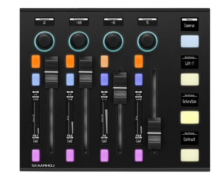 Dieser vielseitige Controller verfügt über vier Kanalzüge mit motorisierten Fadern, die eine präzise Einstellung von Audiopegeln und Parametern ermöglichen. Jeder Kanalzug wird durch dedizierte Tasten und helle OLED-Displays ergänzt, die ein klares visuelles Feedback für eine effiziente Bedienung bieten. Das Gerät umfasst außerdem vier hintergrundbeleuchtete Encoder-Drehregler mit individuellen OLED-Bildschirmen, die eine intuitive Steuerung verschiedener Audioparameter ermöglichen.