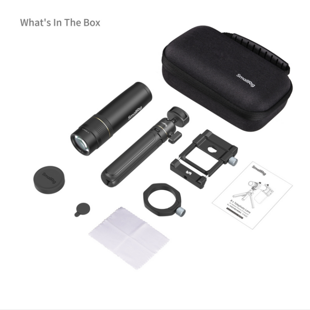 Die Installation ist dank des standardmäßigen T-Mount-Anschlusses ein Kinderspiel, so dass es mit verschiedenen mobilen Geräten kompatibel ist. Damit Sie alles haben, was Sie brauchen, enthält das Paket eine Objektivklemme, ein Stativ, einen Adapter, einen Objektivdeckel, ein Reinigungstuch und ein Benutzerhandbuch, die alle in einer praktischen Aufbewahrungstasche untergebracht sind, um den Zugriff und die Organisation zu erleichtern.