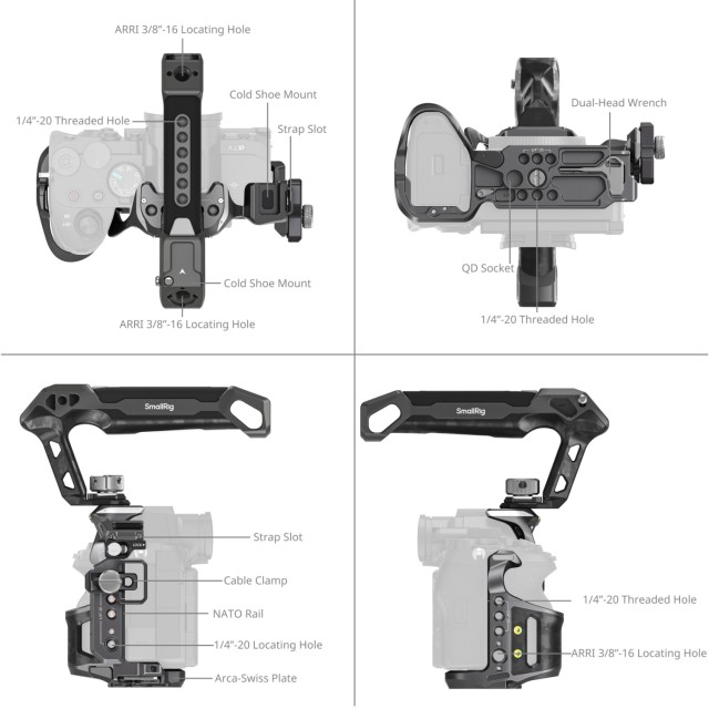 Der Käfig ist mit einem Dreipunkt-Verriegelungssystem ausgestattet, das einen unteren Positionierungsstift, eine 1/4"-20-Schraube und eine M2,5-Schraube auf der linken Seite umfasst, wodurch eine sichere Befestigung ohne Verrutschen gewährleistet ist. Sein elegantes, aerodynamisches Design garantiert einen ungehinderten Zugang zu allen Bedienelementen auf der Oberseite der Kamera für einen reibungslosen Betrieb. Der obere Griff bietet einen bequemen Halt, erleichtert den Transport, das Manövrieren in niedrigen Winkeln und die reibungslose Bewegung der Kamera.