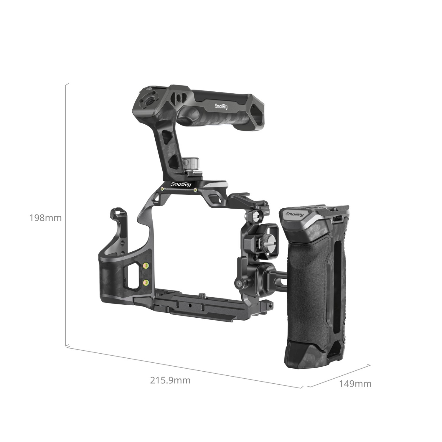 Das Set enthält den „Rhinoceros“-Käfig, den „Rhinoceros“-Obergriff, den „Rhinoceros“-Seitengriff und eine Klemme für das HDMI-Kabel. Der Käfig und die Griffe sind aus Kohlefaser gefertigt, extrem leicht und tragbar – ideal für den längeren Handgebrauch.