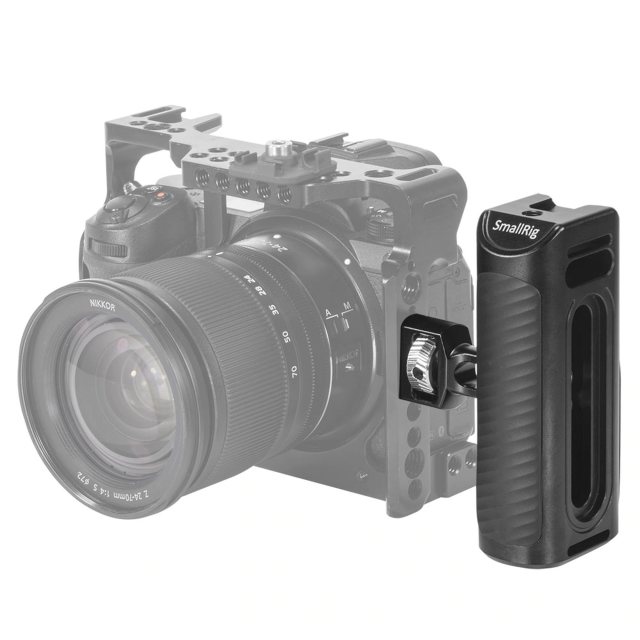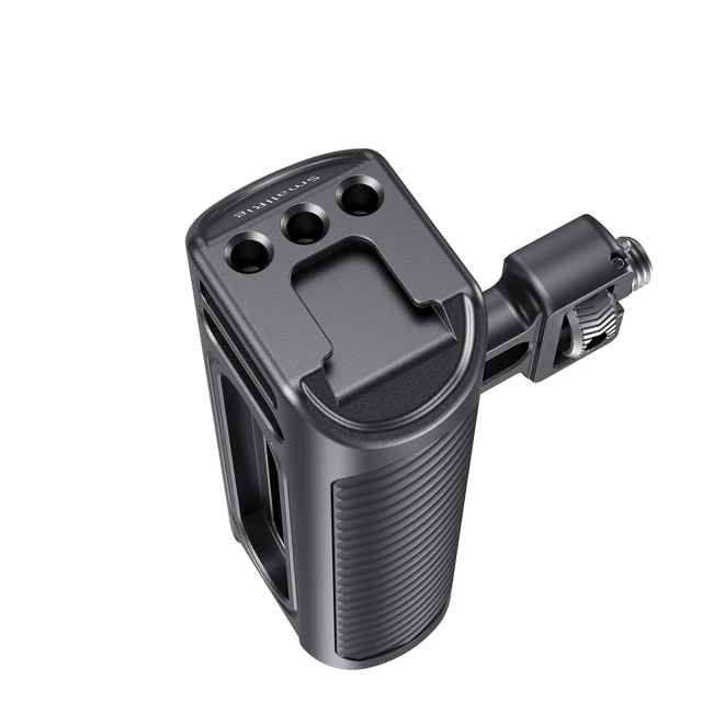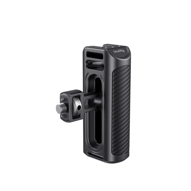 DerSmallRig Aluminum Arri Locating Side Handle HSS2426 wurde entwickelt, um Kameraleuten komfortable Handheld-Aufnahmen zu ermöglichen. Mit einem integrierten Sechskant an der Unterseite kann der Griff nach oben und unten verstellt werden, je nach Bedarf. Wenn Sie den Griff auf der anderen Seite des Käfigs verwenden möchten, können Sie den Sechskant verwenden, um das Verbindungsmetallteil des Griffs abzunehmen und die Richtung zu ändern. Der Griff kann an den Kamerakäfigen mit den Arri-Aufnahmebohrungen an der Seite befestigt werden. Er verfügt über einen Kaltlichtschuh und drei 1/4"-20-Gewindebohrungen für die Montage von Zubehör. Er wiegt nur 226 g und verfügt über ein Aluminiumgehäuse mit rutschfesten Silikongel-Belägen, um komfortable und leichte Handheld-Aufnahmen zu ermöglichen. Außerdem kann dieser Griff mit einer Handschlaufe für mehr Sicherheit verwendet werden.