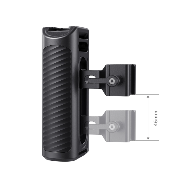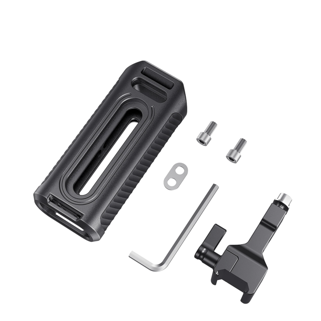 wurde entwickelt, um Kameraleuten komfortable Handheld-Aufnahmen zu ermöglichen. Mit dem eingebauten Sechskant an der Unterseite können Sie den Griff nach oben und unten verstellen, je nach Ihren Bedürfnissen. Wenn Sie den Griff auf der anderen Seite des Käfigs verwenden möchten, können Sie den Sechskant verwenden, um das Verbindungsmetallteil des Griffs zu entfernen und die Richtung zu ändern. Er wird mit einer NATO-Klemme verriegelt und passt an alle Käfige mit NATO-Schiene an der Seite. Es wird mit einem Kaltgeräteschuh geliefert und drei 1/4"-20 Gewindebohrungen ermöglichen die Montage von Zubehör. Er wiegt nur 237 g und verfügt über ein Aluminiumgehäuse mit rutschfesten Silikongel-Belägen, um ein komfortables und leichtes Handheld-Shooting zu ermöglichen. Auch dieser Griff kann für mehr Sicherheit mit einer Handschlaufe verwendet werden.