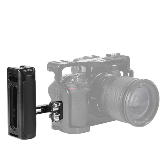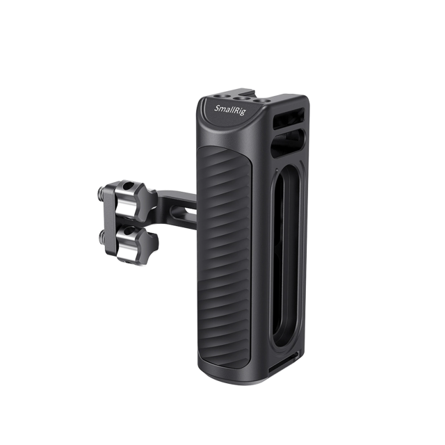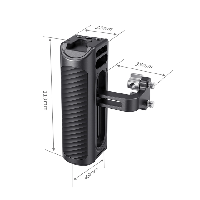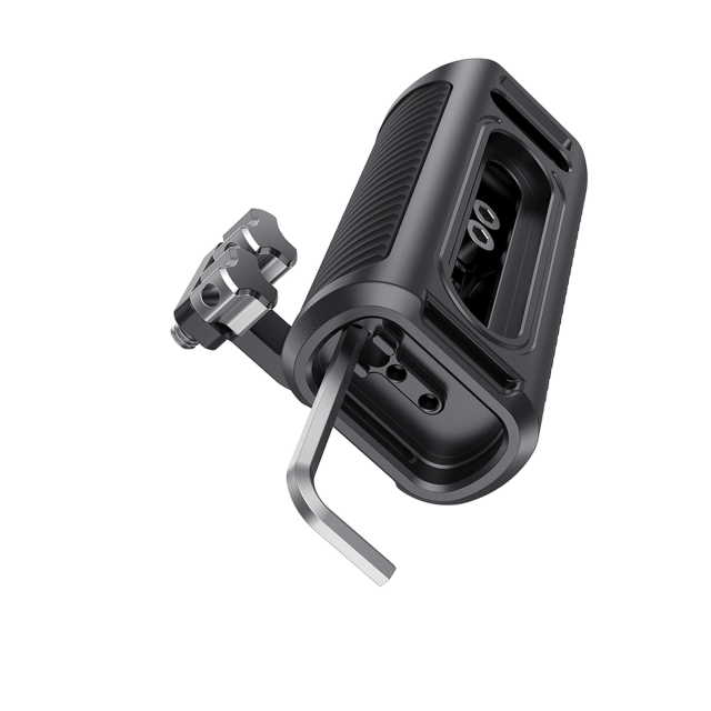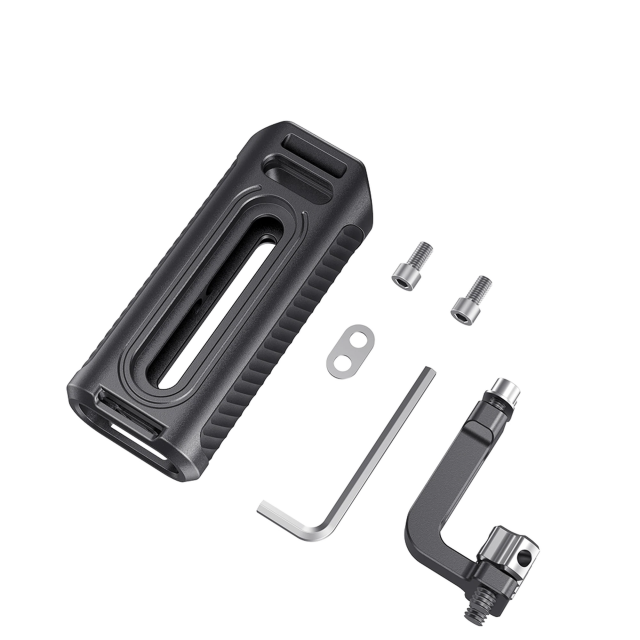 Der SmallRig HSS2425 Aluminium-Universal-Seitengriff wurde entwickelt, um Videofilmern ein komfortables Handheld-Aufnahmeerlebnis zu ermöglichen. Mit dem eingebauten Sechskant an der Unterseite kann der Griff nach oben und unten verstellt werden, je nach Bedarf. Um den Griff auf der anderen Seite des Käfigs zu verwenden, entfernen Sie mit dem Sechskant das verbindende Metallteil des Griffs und ändern Sie die Richtung. Der Griff kann mit zwei 1/4"-20 Schrauben an der linken oder rechten Seite des Kamerakäfigs befestigt werden. Er wird mit einem kalten Fuß und drei 1/4"-20-Gewindebohrungen geliefert, die die Montage von Zubehör ermöglichen. Sie wiegt nur 220 g und hat ein Aluminiumgehäuse mit einer rutschfesten Silikongel-Beschichtung, die komfortable und einfache Aufnahmen aus der Hand ermöglicht. Dieser Griff kann auch mit einer Handschlaufe für zusätzliche Sicherheit verwendet werden.