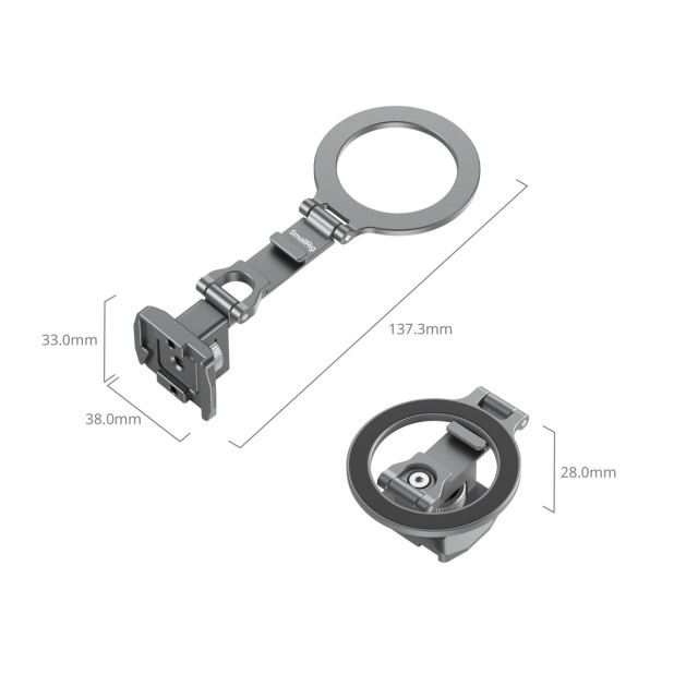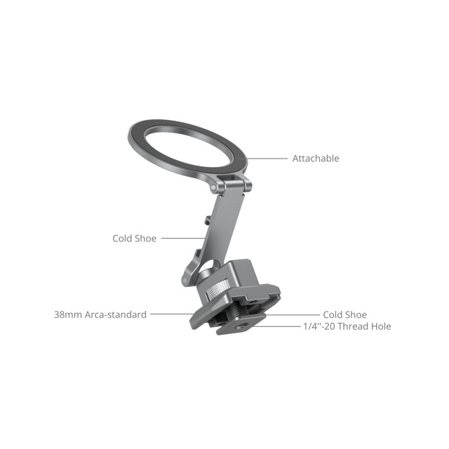 Mit dem Schwerpunkt auf Kompatibilität verfügt sie über 1/4"-20-Gewindebohrungen, Kaltschuhbefestigungen, Arca-Schnittstellen und NATO-Schienen, die eine mühelose Montage von Zubehör wie Videoleuchten, Mikrofonen und Magic Arms ermöglichen. Das MagSafe-Schnellkupplungssystem ermöglicht eine schnelle Montage und Demontage, während der obere Drehpunkt eine werkzeuglose 270°-Neigungseinstellung bietet und der untere Drehpunkt eine 360°-Panoramadrehung und 240°-Neigungseinstellung ermöglicht. Das schlanke, faltbare Design sorgt für einfachen Transport und Lagerung.