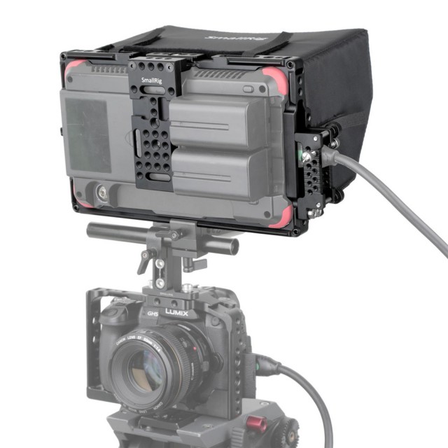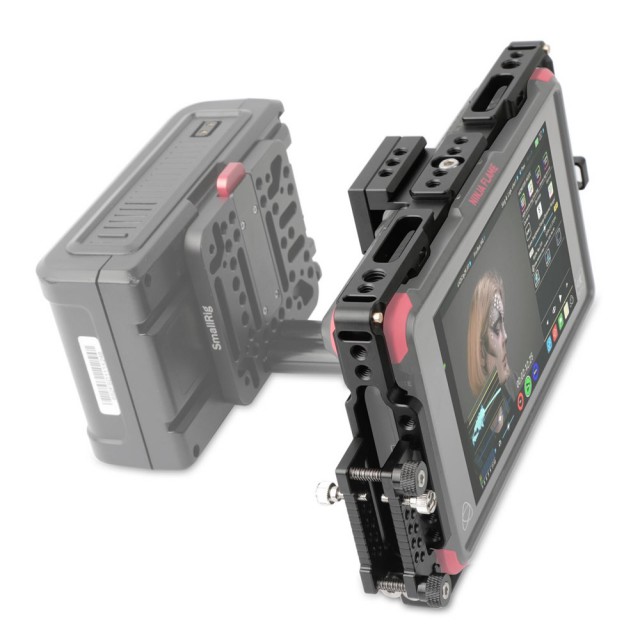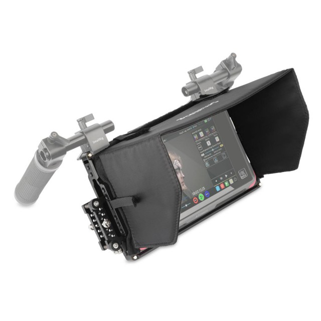 Der SmallRig Atomos 7" Monitorkäfig mit Sonnenblende 2008 wurde speziell für Atomos (Ninja flame, Shogun flame, Shogun Inferno, Ninja Inferno) entwickelt. Der Monitorkäfig wird mit 2 kalten Schuhen an der Oberseite geliefert, die mit dem Rosettengelenkarm (7") 1497 oder dem drahtlosen Mikrofonempfänger und dem drahtlosen Bildsender kompatibel sind. Die exklusiven Löcher für die Sonnenblende dienen zur Befestigung einer Sonnenblende, die den Monitor vor Sonnenlicht schützt. Die NATO-Schienen auf beiden Seiten sind mit der 15-mm-Stabklemme (parallel) 1254, dem 15-mm-Stab 1049 und dem Gummigriff 1616 für handgeführte Aufnahmen kompatibel. An den Käfig können Batterien angeschlossen werden, um während der Aufnahmen genügend Strom zu haben.