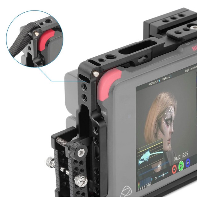 Die Rückseite des Käfigs hilft dem Monitor bei der Wärmeableitung, um die beim Anschluss an den Monitor entstehende Hitze zu verringern. Außerdem verfügt es über HDMI-Klemmen zur Befestigung des HDMI-Kabels mit Schrauben, und 1/4"- und 3/8"-Gewindebohrungen sind für die magischen Arme zugänglich. Darüber hinaus verfügt es über eine SSD-Halterungssperre, die verhindert, dass die SSD beim Herausnehmen herausfällt. Außerdem sind Löcher für die Schultergurte vorgesehen, um die Handhabung zu erleichtern.