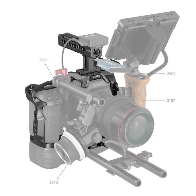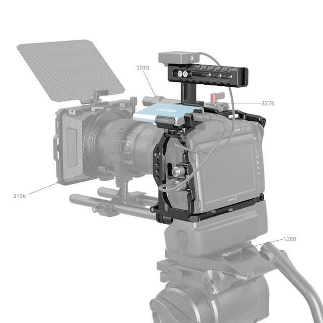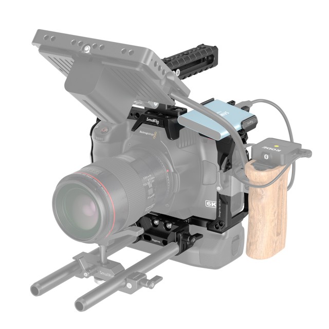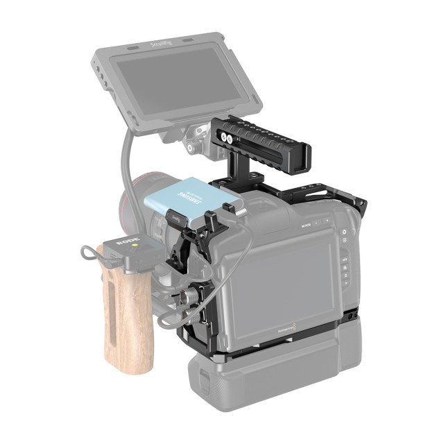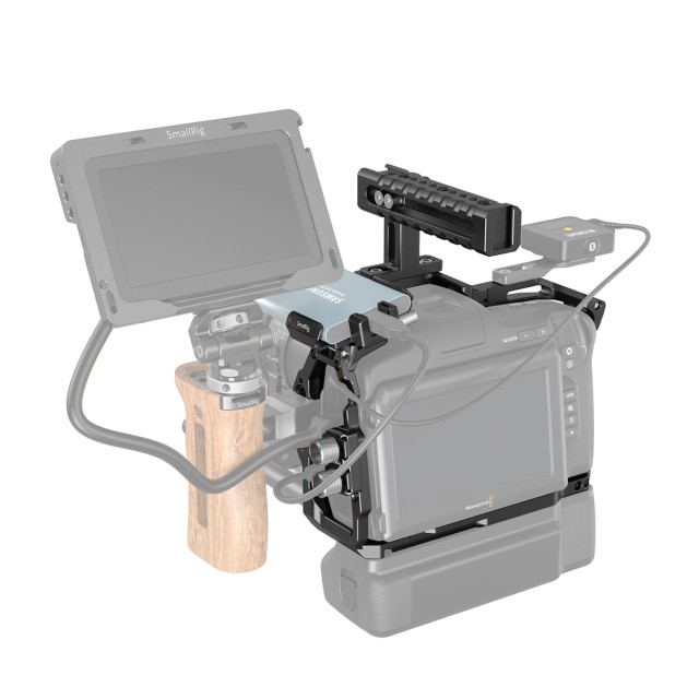 Das SmallRig Basic Kit 3583 ist aus einer Aluminiumlegierung gefertigt, robust und langlebig. Es arbeitet mit einem abnehmbaren Pogo Pin und kann direkt an den Blackmagic Pocket Camera Battery Grip zur Stromversorgung angeschlossen werden und verfügt über mehrere 1/4"-20 Gewindebohrungen zur Aufnahme von anderem Zubehör. Das Kit beinhaltet auch den Top Handle 1984 für Handheld-Aufnahmen und eine leichte Dual Rod Clamp, die für 15mm Dual Rod geeignet ist, um Follow Focus 3010 und Matte Box 2660 oder Mini Matte Box 3196 zu montieren. Die SSD-Halterung ist ein Kaltschuhdesign, das eine schnelle Montage und Demontage ermöglicht. Die Daumenkabelklemme hilft beim Festklemmen von HDMI- und USB-C-Kabeln, um Signalunterbrechungen durch Kabelverlust während des Filmens zu vermeiden.