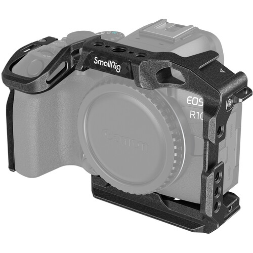 Das SmallRig "Black Mamba" Cage 4004B für die Canon EOS R10 bietet ein formschlüssiges, leichtes Design, das den vollen Zugang zu Anschlüssen und Bedienelementen bewahrt und gleichzeitig mehrere Befestigungsmöglichkeiten, einen integrierten Arca-Type-Sockel und einen robusten Schutz für Ihre Kamera bei Aufnahmen bietet.