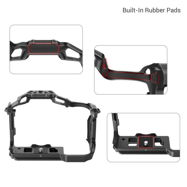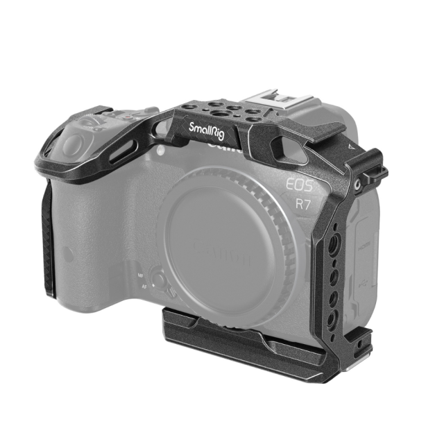 Der SmallRig "Black Mamba" Käfig für die Canon EOS R7 4003 wurde entwickelt, um Schutz und mehrere Befestigungspunkte für Zubehör zu bieten. Die Kamera wird über eine 1/4"-20 Schraube an der Unterseite und einen seitlichen Verriegelungsadapter an beiden Seiten verriegelt. Der Käfig verfügt über Silikonpolster, die Kratzer verhindern, und den "Black Mamba"-Stil, der vollen Zugriff auf alle Bedienelemente der Kamera ermöglicht. Außerdem verfügt er über 1/4"-20-Gewindebohrungen und ARRI 3/8"-16-Aufnahmebohrungen für die Seitenhandgriffe 2093 und 3814, den oberen Handgriff 3786 und 3765, den Magic Arm 2070, die Monitorhalterung 2903, den Halter für tragbare Stromversorgungsgeräte 2336, die Stabklemme 3598 usw.; Kaltschuhhalterungen für die Befestigung von Mikrofon und LED-Licht; NATO-Schienen für die Seitenhandgriffe 3260 und 3813 sowie Gurtschlitze für den Handriemen 3848 und den Kameraschulterriemen PSC2428. Die Arca-Swiss-Schnellwechselplatte an der Unterseite unterstützt den DJI RS 2 / RSC 2 Stabilisator und das Arca-Swiss-Stativ, um einen schnellen Wechsel zwischen Handheld-, Stabilisator- und Stativaufnahmen zu ermöglichen. Die eingebaute QD-Buchse an der Unterseite ist für die Befestigung des Schnellkupplungsgurtsystems vorgesehen. Außerdem ist ein doppelseitiger Schraubenschlüssel für eine einfache Demontage enthalten.