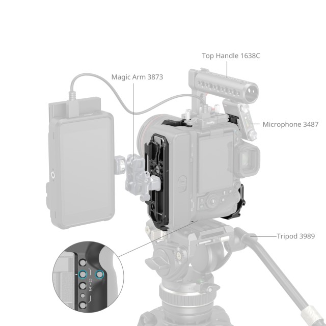 Ausgestattet mit mehreren 1/4"-20- und 3/8"-16-Gewindebohrungen sowie ARRI-Positionierungslöchern nimmt er verschiedenes Zubehör auf, darunter obere Griffe (ID 4757, 3765) für sanfte Kamerabewegungen, seitliche Griffe (ID 4015, 4346), Monitorhalterungen (ID 2903B, 2904B) und Magic Arms (ID 3873). Drei Kaltschuhhalterungen ermöglichen die Befestigung von Mikrofonen (ID 3487) und LED-Leuchten (ID 4660).