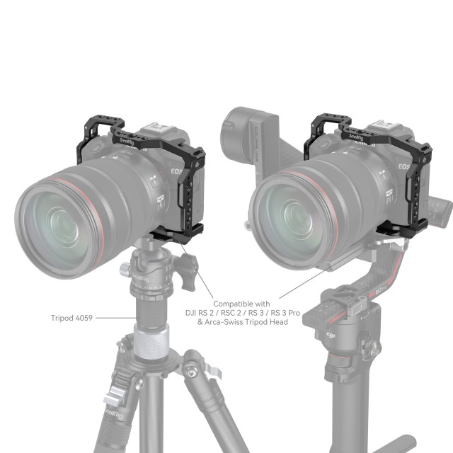 An der oberen Kaltschuhhalterung lassen sich Mikrofon 3468 und LED-Videoleuchte 3286B befestigen, und die linke NATO-Schiene passt zu den drehbaren Seitengriffen 3260 und 3813. Auf der rechten Seite befindet sich eine 1/4"-20-Gewindebohrung für die Kabelklemme 1693. Außerdem gibt es eine QD-Buchse für eine Schnellwechsel-Schultergurtschnalle und eine untere Arca Swiss Schnellwechselplatte für ein Arca-Stativ oder einen DJI RS 2 / RSC 2 / RS 3 / RS 3 Pro Gimbal für einen schnellen Wechsel zwischen Gimbal-, Handheld- und Stativaufnahmen. Ein Schraubendreher ist für die einfache Montage und Demontage enthalten.