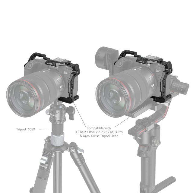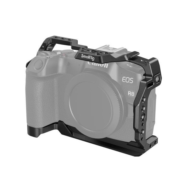 SmallRig Cage für Canon EOS R8 4212 wurde entwickelt, um die Kamera zu schützen und Zubehör anzubringen. Die Kamera wird über eine untere 1/4"-20-Schraube und zwei seitliche Verriegelungsadapter verriegelt. Der Käfig ist mit Gummipads ausgestattet, die Kratzer verhindern, und bietet vollen Zugang zu Tasten, Kartensteckplätzen, Flip Screen und Batteriefach. Zu den Zubehörhalterungen gehören 1/4"-20-Gewindebohrungen, 3/8"-16-Gewindebohrungen und ARRI 3/8"-16-Aufnahmebohrungen für den oberen Handgriff 3765, den seitlichen Handgriff 2093C, die Monitorhalterung 2903B und den Magic Arm 3875; an der oberen Kaltschuhhalterung lassen sich das Mikrofon 3468 und die LED-Videolampe 3286B befestigen, und die linke NATO-Schiene passt zum drehbaren seitlichen Handgriff 3260 und 3813.