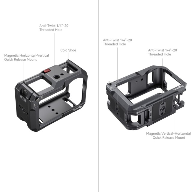 Der Käfig verfügt über 1/4"-20-Gewindebohrungen und eine Kaltlichthalterung, an der Sie Zubehör wie Mikrofone, Lampen und vieles mehr befestigen können, um Ihr Setup zu verbessern. Mit dem magnetischen Schnellwechselsystem können Sie mühelos zwischen dem horizontalen und dem vertikalen Modus wechseln; es ist mit dem Original-Schnellwechseladapter kompatibel und ermöglicht mühelose Übergänge.