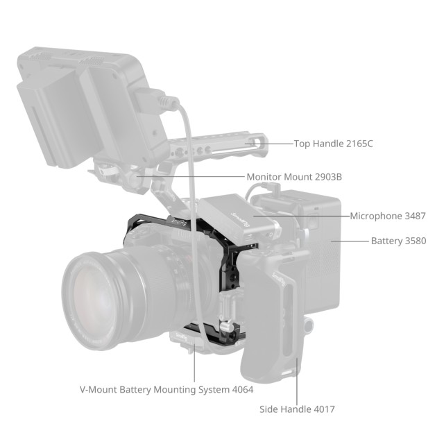 Der Käfig verfügt über mehrere 1/4"-20-Gewindebohrungen und ARRI-Positionierungsbohrungen zur Befestigung von verschiedenem Zubehör, wie z. B. seitliche Griffe (ID 2093, 4015 und 2913), obere Griffe (ID 3765, 4483), magische Arme (ID 3959, 3873), Monitorhalterungen (ID 2903B, 4487), Manfrotto-Grundplatten (ID 4638, 3158B) und mehr. Darüber hinaus verfügt er über eine integrierte Kaltlichthalterung zur Befestigung von Zubehör wie Mikrofonen (ID 3468) und LED-Videoleuchten (ID 4660). Der Käfig verfügt außerdem über eine integrierte NATO-Schiene zur Anbringung von Zubehör wie Seitengriffen (ID 4485, 3260, 3813) und magischen Armen (ID 3875).