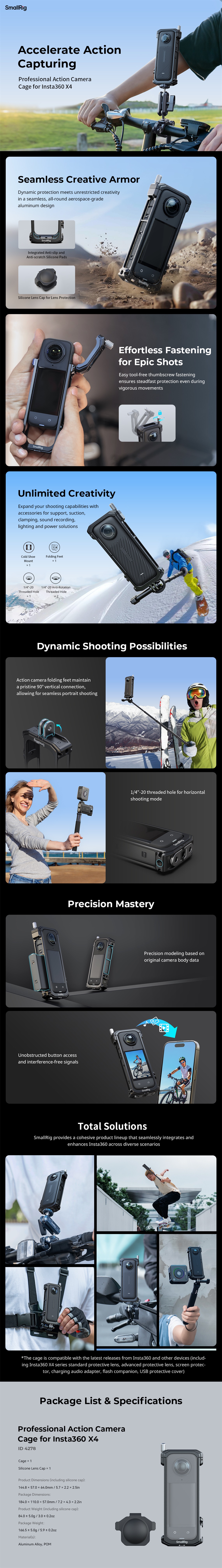 SmallRig Cage für Insta360 X4 4278 bietet Schutz für die Kamera und eine Vielzahl von Erweiterungszubehör für zusätzlichen Komfort während der Aufnahme. Durch das Design mit seitlichen Aussparungen bietet der Käfig ungehinderten Zugang zum Batteriefach und ermöglicht einen schnellen Batteriewechsel ohne Demontage des Käfigs. Der Käfig liegt eng an der Action-Kamera an und ist innen mit Silikonpolstern ausgestattet, um Kratzer am Kameragehäuse zu vermeiden. Die Kamera wird von oben in den Käfig eingesetzt und mit einer Rändelschraube gesichert, so dass für die Installation kein Werkzeug erforderlich ist. Der Käfig verfügt über einen Kaltschuhanschluss und eine seitliche 1/4"-20-Gewindebohrung zur Befestigung von Mikrofonen, LED-Videolicht und anderem Fotozubehör. Das untere Action-Kamera-Interface kann zur Aufbewahrung zusammengeklappt werden und verfügt außerdem über eine 1/4"-20 Gewindebohrung zur direkten Befestigung von 1/4"-20 Schraubenstativen, Selfie-Sticks(4758) und mehr. Im Lieferumfang enthalten ist eine Silikon-Linsenkappe zum Schutz des Objektivs bei der Aufbewahrung.