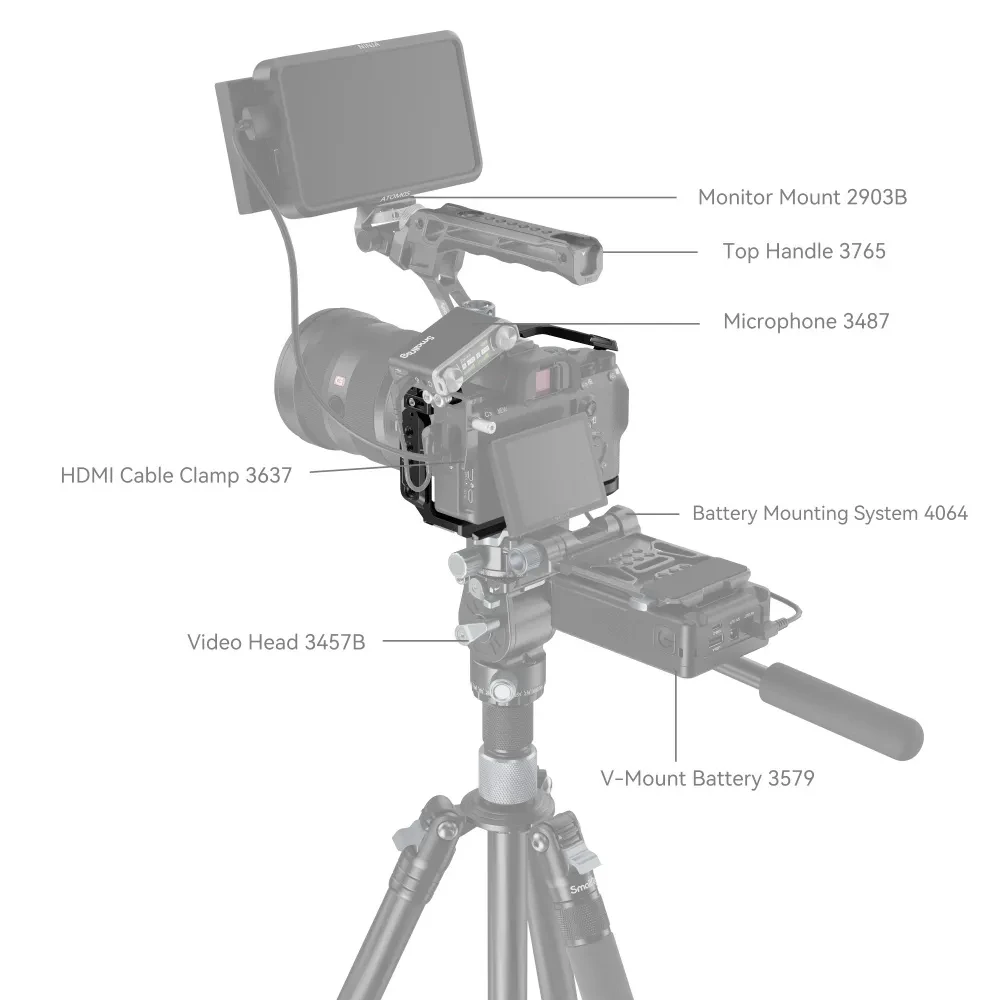 Es blockiert nicht den Zugang zu allen Anschlüssen und Tasten, so dass der Blitzschuh an der Kamera mit Sony XLR 2KM und XLR-K1M oder Blitzlicht mit genügend Platz montiert werden kann. 1/4''-20 Gewindebohrungen auf der Oberseite können mit dem Top Handle 1984/1638 für handgeführte Aufnahmen oder mit der EVF-Halterung 1842 für bessere Aufnahmen montiert werden