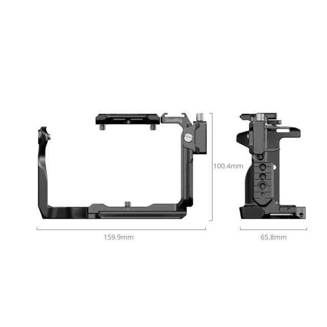 Die abnehmbare Deckplatte verfügt über eine NATO-Schiene, an der der XLR-Top-Handgriff von Sony oder der drehbare Top-Handgriff von SmallRig (ID 4152) angebracht werden kann, ohne den EVF zu beeinträchtigen. Der Cage verfügt über mehrere Befestigungspunkte, darunter 1/4"-20-Gewindebohrungen, 3/8"-16-ARRI-Befestigungslöcher und eine „HawkLock”-NATO-Schiene für die schnelle Befestigung von Zubehör wie Seitengriffen (ID 4485) und Top-Handles (ID 4483). Eine Kaltschuhhalterung ermöglicht die Befestigung von Geräten wie dem DJI Mic 2 oder LED-Leuchten, während eine QD-Buchse an der Basis Schultergurte für eine bessere Tragbarkeit aufnimmt. Die Basis ist außerdem mit einem magnetischen Inbusschlüssel ausgestattet, der eine schnelle Montage und Demontage ermöglicht.
