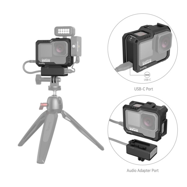 Dieser passgenaue Käfig ist so gefertigt, dass er sich nahtlos um Ihre GoPro schmiegt, ohne die Funktionalität zu beeinträchtigen, einschließlich der Unterstützung für den Max-Objektivwechsel. Er verfügt über eine Schnellwechsel-Audioadapterhalterung an der Unterseite zum einfachen Anbringen und Abnehmen von Audiozubehör, während die Schnellwechsel-Seitenplatte einen mühelosen Zugriff auf den USB-C-Anschluss zum Aufladen oder zur Datenübertragung ermöglicht, ohne den Käfig entfernen zu müssen.