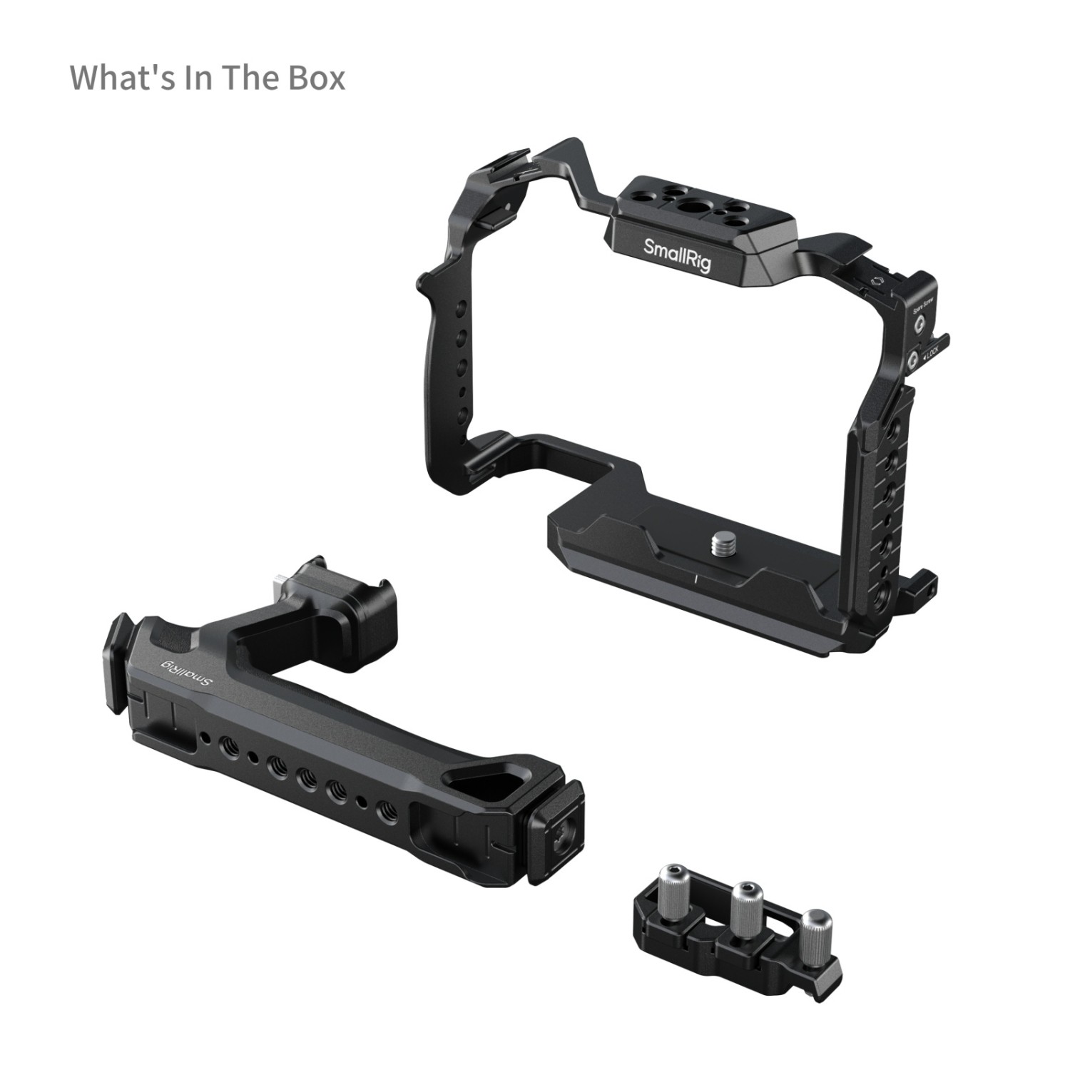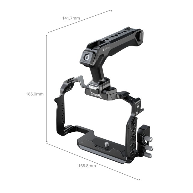 Das SmallRig Cage Kit für Panasonic G9 II / S5 II / S5 IIX 5752 wurde entwickelt, um Handaufnahmen zu erleichtern und Zubehör anzubringen. Es umfasst einen Cage, eine HDMI- und USB-C-Kabelklemme sowie einen oberen Griff, der ergonomisch gestaltet ist, um den Halt zu verbessern, und über eine NATO-Klemme mit dem Cage verbunden wird. Die mit einer Rändelschraube festgezogene Kabelklemme kann gleichzeitig HDMI- und USB-C-Kabel befestigen. Unter den Befestigungspunkten für Zubehör unterstützen 1/4"-20-Gewindebohrungen den Seitengriff 3323; Kaltschuhhalterungen eignen sich für den SSD-Halter 5196, Mikrofone, LED-Videoleuchten, Monitore usw.; und ARRI 3/8"-16-Befestigungsbohrungen passen zur Monitorhalterung 2903B. Außerdem verfügt sie über eine HawkLock H21 NATO-Schiene auf der linken Seite für den Seitengriff 4485 und Riemenlöcher auf beiden Seiten, die mit Handriemen kompatibel sind. Darüber hinaus ist ein Magnet-Schraubenschlüssel für eine einfache Demontage und Montage im Lieferumfang enthalten.