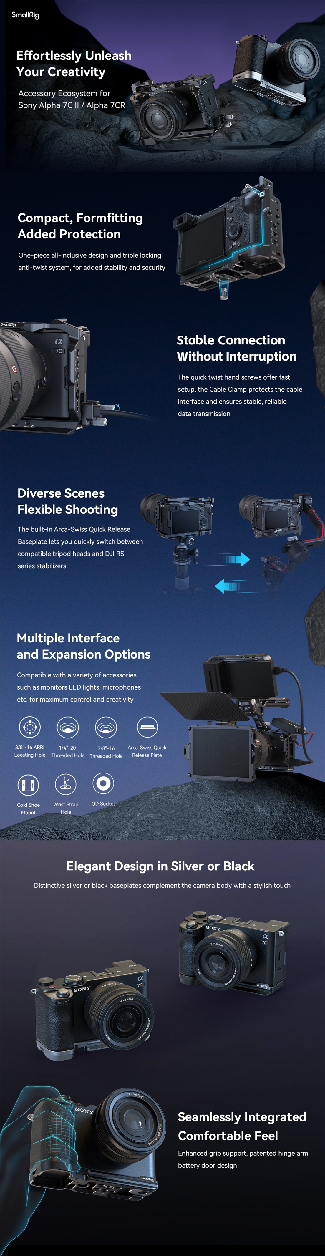 Das SmallRig Cage Kit für Sony Alpha 7C II / Alpha 7CR 4422 wurde entwickelt, um Zubehör zu befestigen und die Kamera und den HDMI-Anschluss zu schützen. Es umfasst einen Käfig und eine HDMI-Kabelklemme. Der Käfig sichert die Kamera mit einer 1/4"-20 Schraube auf der Unterseite und einer M2,5 Schraube auf der rechten Seite, mit eingebauten Polstern, die Kratzer verhindern. Der Scharnierarm am Batteriefachdeckel passt sich der Kamerakrümmung besser an und lässt Platz für den kleinen Finger, um mehr Komfort zu bieten. Die HDMI-Kabelklemme lässt sich mit einer Rändelschraube schnell an der linken Seite des Käfigs befestigen und schützt den HDMI-Anschluss, um eine stabile Übertragung zu gewährleisten. Im Lieferumfang sind mehrere Befestigungspunkte für die Anbringung von Zubehör enthalten, darunter 1/4"-20-Gewindebohrungen und ARRI 3/8"-16-Aufnahmebohrungen für den oberen Handgriff 3765, den seitlichen Handgriff 2913; eine obere ARRI 3/8"-16-Aufnahmebohrung für die Monitorhalterung 2903B; kalte Schuhe für Mikrofon, LED-Videoleuchte; eine NATO-Schiene für den drehbaren NATO-Griff (linke Seite) 3260; integrierte M4-Gewindebohrungen an der unteren Vorderseite, die mit der Horizontal-Vertikal-Montageplatte 4424 kompatibel sind und einen schnellen Wechsel zwischen vertikalen und horizontalen Aufnahmen ermöglichen; und eine untere QD-Buchse zur Befestigung von Schultergurten. Die Arca Swiss Schnellwechselplatte an der Unterseite unterstützt DJI RS 2 / RSC 2 / RS 3 / RS 3 Pro Gimbals sowie die Schnellwechselplatte der DJI RS 2 / RSC 2 Gimbals und die Arca-Type Quick Release Plate 3154. Der Käfig verfügt außerdem über Löcher an beiden Seiten und an der Unterseite für die Befestigung von Zubehör wie Handriemen 3848, Schulterriemen PSC2428 usw. Außerdem ist ein magnetischer Inbusschlüssel für eine einfache Demontage und Montage enthalten.