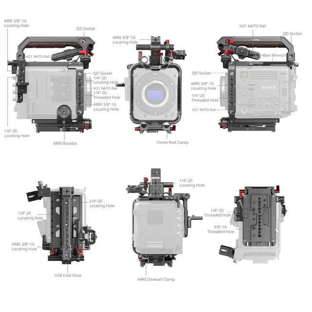 Das SmallRig Cage Kit für Sony BURANO 4571 wurde zum Schutz der Sony BURANO Kamera und zur Befestigung von Zubehör entwickelt. Es verfügt über ein Full-Wrap-Design, um das Kameragehäuse effektiv zu schützen. Der obere Griff hat ein bequemes, ergonomisches Design mit Holzmaterial für einen angenehmen Griff und eine hochwertige Textur; er unterstützt eine schnelle Installation und eine Vorwärts-/Rückwärtsverstellung für eine einfache Anpassung des Schwerpunkts und einen müheloseren Griff. Die Monitorhalterung ersetzt die ursprüngliche Monitorhalterung, um einen schnellen Wechsel zwischen LCD- und Suchermodus zu ermöglichen. Die HawkLock-Struktur ermöglicht eine schnelle Einstellung. Die obere modulare 15mm Dual-Stab-Klemme ist besser geeignet für Handheld-Aufnahmen, leicht zu erweitern, die Follow-Fokus und anderes Zubehör, im Vergleich mit der Verwendung von 15mm LWS Grundplatte Schwerpunkt niedriger ist, wodurch der Druck auf den Stativkopf. HDMI-Kabelklemme, um die Schnittstelle und Signalübertragung Stabilität zu schützen, und die drahtlose Videoübertragung Halterung Lösung für die kompakte Installation von drahtlosen Videoübertragung.15mm LWS Grundplatte mit Quick-Release-Design, kann schnell an der Unterseite des Käfigs montiert werden, bequem für Multi-Szene wechseln. Der Bausatz enthält ARRI 3/8"-16 Gewindebohrungen, 1/4"-20 Fixierbohrungen, 1/4"-20 Gewindebohrungen, 3/8"-16 Gewindebohrungen, QD-Buchsen, H21 NATO-Schienen, H18 Cold Shoes, ARRI Dovetail Clamp, etc. Der obere Griff und die 15-mm-LWS-Grundplatte lassen sich ohne Werkzeug schnell demontieren und montieren, um sie bequem zu lagern und zu transportieren.