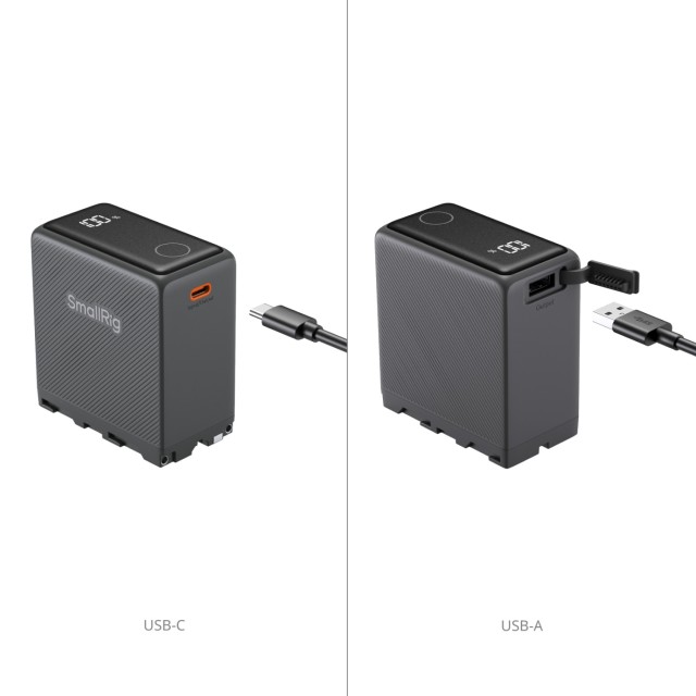 Der Hauptanschluss an der Basis versorgt eine Vielzahl von Geräten mit Strom, darunter Kameras, LED-Leuchten, Monitore und motorisierte Slider. Außerdem verfügt er über einen USB-C-Anschluss (Eingang/Ausgang) und einen USB-A-Ausgang (max. 27 W) zum Laden von Geräten wie Smartphones und Tablets. Der USB-C-Anschluss unterstützt 36-W-Power-Delivery-Schnellladen, sodass der Akku in nur 2 Stunden vollständig aufgeladen werden kann.Die USB-C- und USB-A-Anschlüsse verwenden unabhängige Schaltkreise, sodass zwei Geräte gleichzeitig mit hoher Geschwindigkeit aufgeladen werden können.