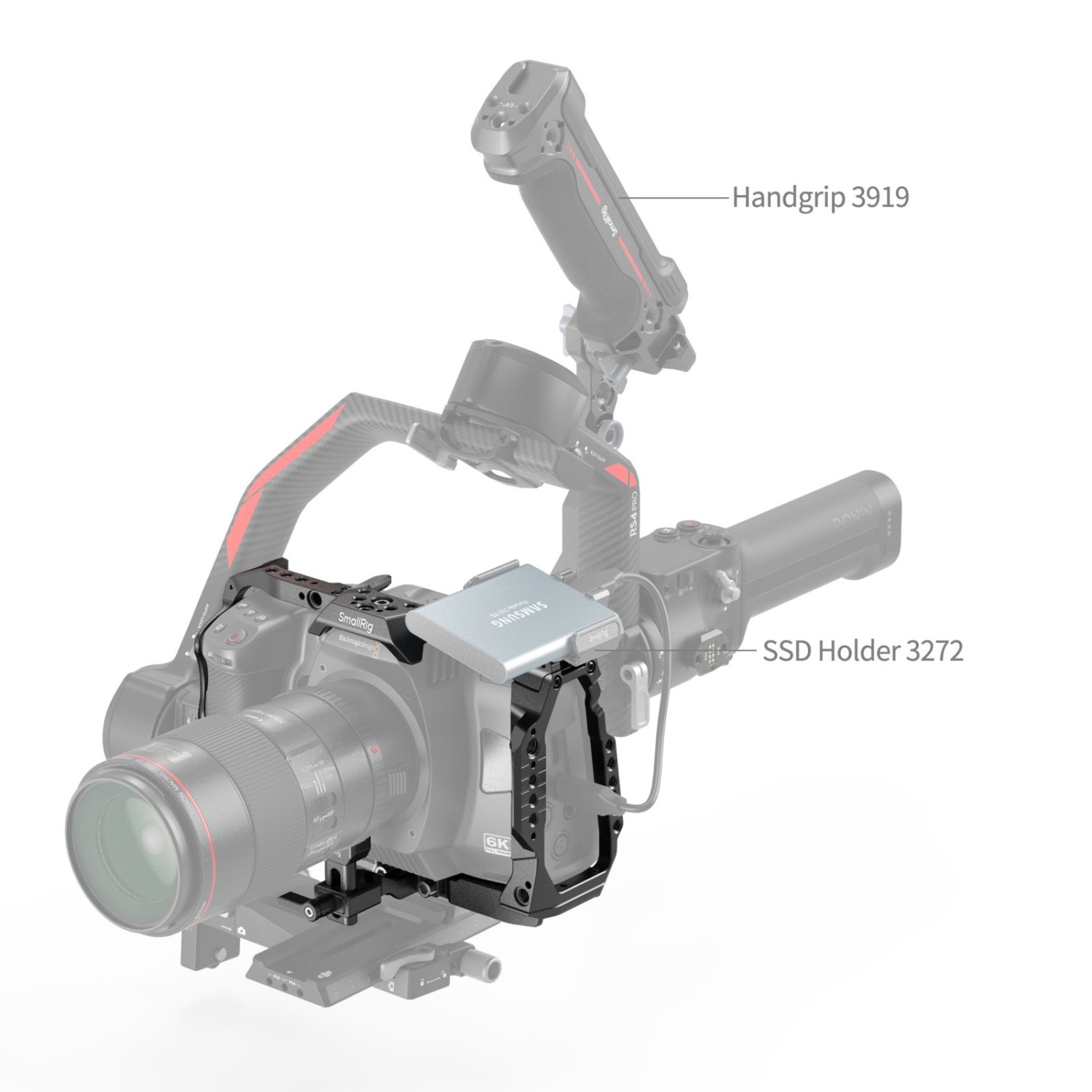Der SmallRig Kamerakäfig für die Blackmagic Design Cinema Camera 6K 4785 wurde für handgeführte Aufnahmen mit sanften Kamerabewegungen entwickelt. Es schützt die Kamera und bietet gleichzeitig verschiedene Erweiterungsmöglichkeiten. Das Dreipunkt-Verriegelungssystem sichert die Kamera mit zwei 1/4"-20 Schrauben an der Basis und einer 1/4"-20 Schraube an der Oberseite, während integrierte Silikonpads Kratzer verhindern. Der Käfig bietet ungehinderten Zugang zu allen Kameraschnittstellen, Kartensteckplätzen, dem Klappbildschirm und dem Batteriefach.