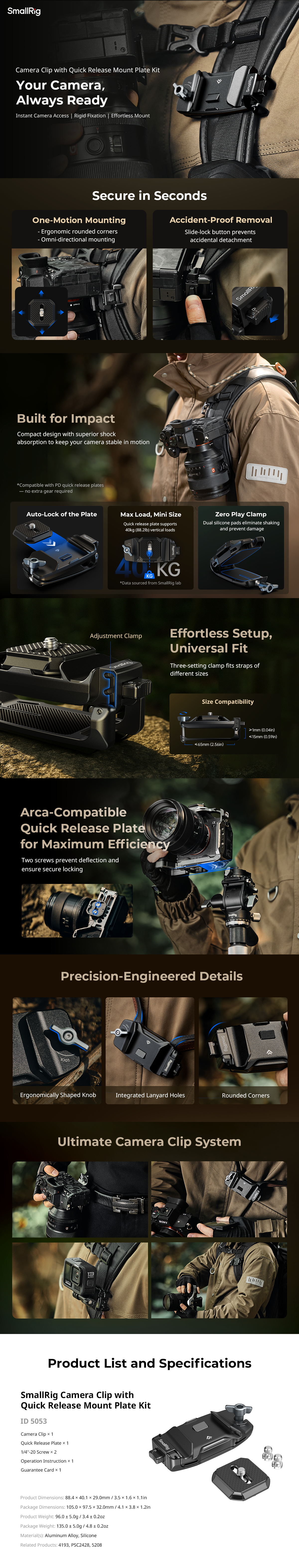 Das SmallRig Camera Clip with Quick Release Mount Plate Kit 5053 wurde speziell für Fotografen entwickelt, die ständig unterwegs sind. Das Kit umfasst einen Kameraclip, eine Schnellwechselplatte und eine 1/4''-20 Schraube und bietet ein benutzerfreundliches Design: Die Schnellwechselplatte kann in jede Richtung eingesetzt werden und rastet automatisch ein. Außerdem unterstützt sie einen Einfachauslöser, der eine hocheffiziente Montage und Demontage gewährleistet.