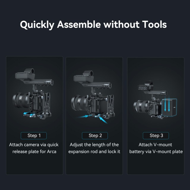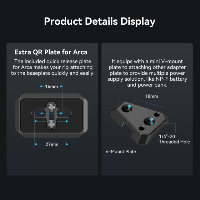 DasSmallRig Compact V-Mount BatteryMountingSystem 4064isteine kompakte, leichte und praktische All-in-One-Befestigungslösung für V-Mount-Akkus. Das Kit besteht aus einer V-Mount-Akkuplatte, einer Arca-Schnellwechselplatte und einer V-Mount-Platte. Insbesondere die Grundplatte kann so verlängert werden, dass sie für spiegellose Kameras und DSLRs verschiedener Größen geeignet ist, was durch die werkzeuglose Installation und Einstellung schnell und zeitsparend möglich ist. Im Gegensatz zu Käfigen mit integrierter Arca-Platte kann es die Kamera und die Gimbals der DJI RS-Serie über die Arca Swiss Schnellwechselplatte direkt tragen. Die V-Mount-Batterieplatte mit 1/4"-20-Gewindebohrungen und einer V-Mount-Platte bietet mehr Stromversorgungslösungen durch die Befestigung der NP-F-Batterieadapterplatte Professional Edition 3168 oder der Halterung für tragbare Powerbanks BUB2336. Dank der unteren Arca-Platte ist auch der Wechsel zwischen Handaufnahmen und Stativaufnahmen einfacher. Die um 90 Grad drehbare V-Mount-Batterieplatte lässt genügend Platz für einen Klappbildschirm, wobei eine Schwenkdämpfung verhindert, dass Ihr Gerät herunterfällt. Sie kann für mehr Kompaktheit und Tragbarkeit heruntergeklappt werden.