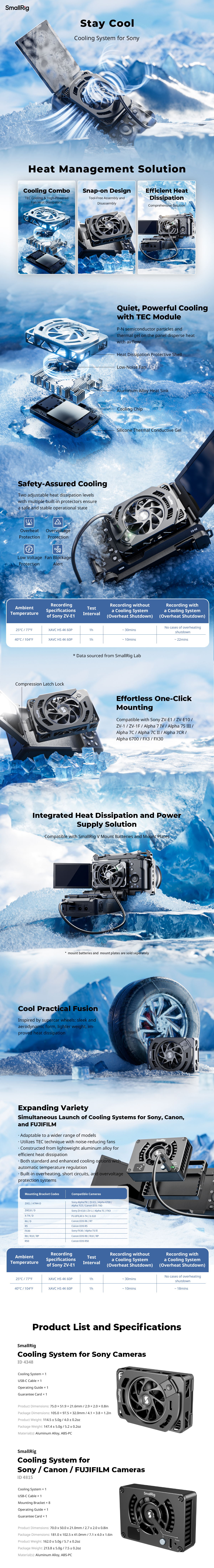 Das SmallRig-Kühlsystem für Sony-Kameras 4348 wurde entwickelt, um spiegellose Sony-Kameras zu kühlen und die Aufnahmedauer von hochwertigen Videos zu verlängern. Das Kühlsystem nutzt einen hocheffizienten Lüfter mit einem TEC-Kühlmodul, um die Kamera schnell zu kühlen und Überhitzungsprobleme effektiv zu beseitigen. Das Kühlsystem ist in zwei Geschwindigkeiten einstellbar, um unterschiedlichen Aufnahmeanforderungen gerecht zu werden. Federbelastete Schnappbefestigung für schnelle Montage und Demontage, einfachen Zugang zum Kühlsystem und Aufbewahrung des LCD-Bildschirms der Kamera. Kann mit oder ohne Kamerakäfig verwendet werden, ist leichter und freier in der Handhabung. Das Kühlsystem ist kompatibel mit dem V-Mount Battery Mount Plate Kit 4064B / 4063B, mit V-Mount-Akku 3579 / 3580 / 4292 verwenden, Wärmeableitung und Stromversorgung ohne Sorgen.