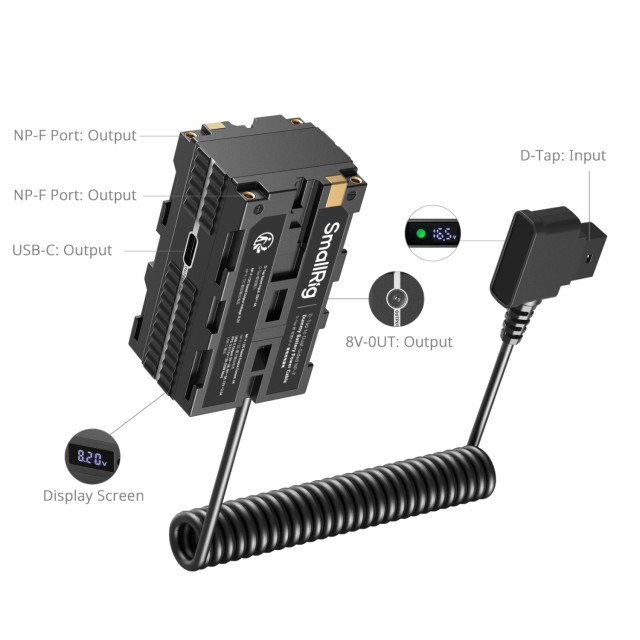 Das für Mobilität und effizientes Kabelmanagement konzipierte Stromkabel ist mit zwei Anzeigen und einem Indikator ausgestattet. Der D-Tap-Anschluss verfügt über eine Anzeige für die Eingangsspannung und eine Anzeige für die Verpolungswarnung und den Eingangsspannungsbereich, während die Blindbatterieanzeige NP-F und die DC-Eingangsspannung anzeigt.