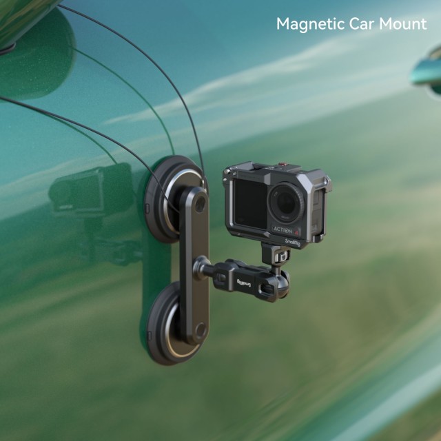 Das SmallRig Dual Magnetic Suction Cup Mounting Support Kit für Action-Kameras 4467 wurde für die Aufnahme von Autoszenen mit einer Action-Kamera entwickelt. Es wird nur empfohlen, es auf flachen Eisenoberflächen zu verwenden, wie z. B. Eisentüren, Geländer, Küchengeräte, Sportgeräte, usw. Das exklusive Dual-Material-Design kombiniert Magnete mit einem Vakuumsauger und sorgt so für sicherere, länger anhaltende und stabilere Aufnahmen. Selbst in dem unwahrscheinlichen Fall, dass der Silikon-Saugnapf aufgrund starker Vibrationen ausläuft, können die Magnete die gesamte Halterung an die Oberfläche eines Autos aus Eisen ziehen (innerhalb der Tragfähigkeit von 0,35 kg bei einer dynamischen Aufnahmeszene auf einer flachen Straße, wenn die Höchstgeschwindigkeit 120 km/h nicht übersteigt), wodurch das Risiko des Herunterfallens aufgrund eines auslaufenden Silikon-Saugnapfes effektiv vermieden wird. Das Set enthält einen magnetischen Saugnapf für jeden Fuß, einen magischen Arm und eine Action-Kamera-Halterung. Die 1/4"-20-Schraube an einem Ende ermöglicht die Befestigung einer Action-Kamera, eines Monitors, einer LED-Videolampe, eines Mikrofons usw., und die eingebauten Gummistifte unterstützen SmallRig 3084C, 3083C, 4088B, 4119B und anderes Zubehör mit Fixierlöchern, um eine Ablenkung zu verhindern.