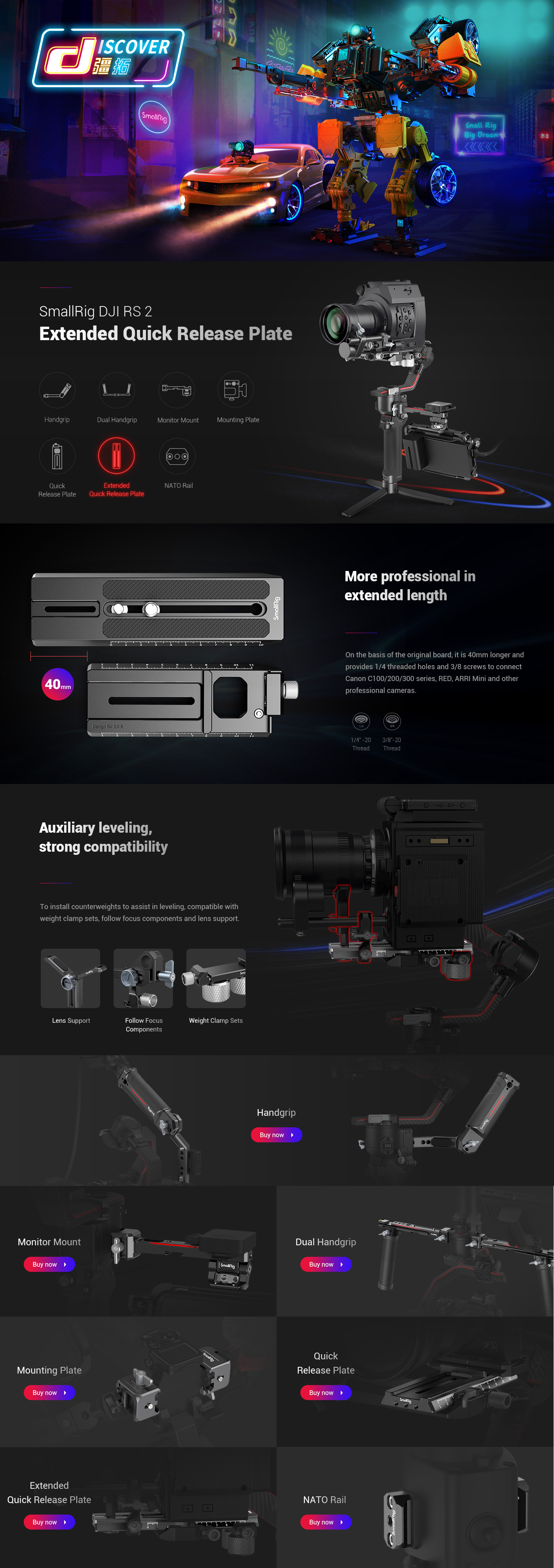 SmallRig Extended Quick Release Plate für DJI RS 2 / Ronin-S / RS 3 / RS 3 Pro 3031B wurde entwickelt, um professionelle Kameras wie Canon C100/200/300, RED und Komodo am Gimbal zu befestigen. Die verlängerte Platte verlängert die Platte um 40 mm im Vergleich zur ursprünglichen Kameraplatte. Sie können das Gegengewichts-Kit 3125 an der Rückseite anbringen, um den Stabilisator auszubalancieren, die Objektivstütze 2850 zum Schutz der Objektivhalterung anbringen und die Fokusmotor-Komponente 2851, um den DJI-Fokusmotor anzuschließen, wenn das Objektiv an einem großen Kameragehäuse oder einer Kamera mit Batteriegriff montiert ist. Darüber hinaus kann eine 1/4"-20 Gewindebohrung an der Unterseite zum Hinzufügen des Gegengewichts AAW2284 oder AAW2285 für die Balance verwendet werden.