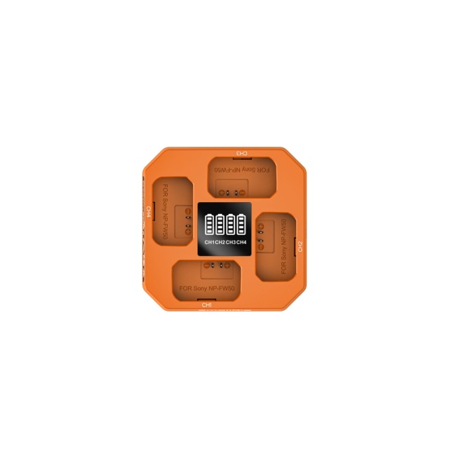 Die vier dedizierten Kanäle ermöglichen das gleichzeitige Laden von vier NP-FW50-Akkus und bieten effizientes Schnellladen, um anspruchsvolle Drehpläne zu erfüllen.