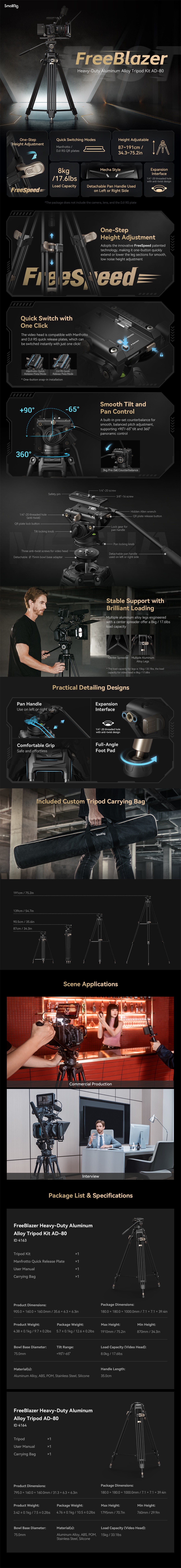SmallRig FreeBlazer Heavy-Duty Aluminum Alloy Tripod Kit AD-80 4163, je sada stativu pro video usnadňující natáčení videa. Stativ má nastavitelné nohy, které se rychle zasouvají a vysouvají pomocí flip-locků, s výškou od 87 cm do 191 cm a délkou ve složeném stavu 90,5 cm. Videohlava vybavená tlumicím systémem umožňuje plynulé otáčení kamery. Pokud je její těžiště umístěno ve výšce 55 mm, může panorámování a přednastavený systém protiváhy pomoci přesně ovládat kameru nebo jiné zařízení s hmotností až 3 kg pro skvělé dynamické vyvážení.