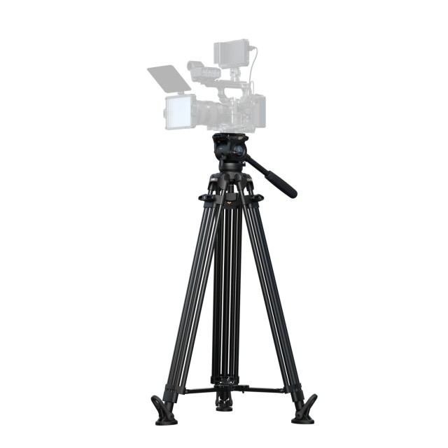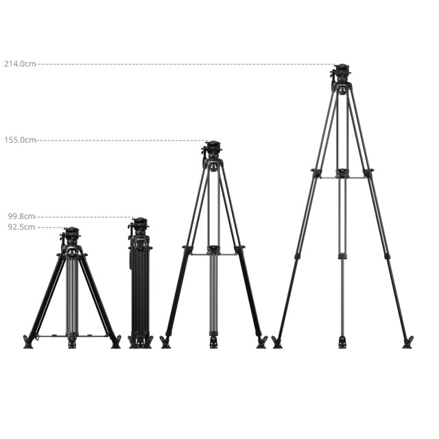 Das Stativ besteht aus Beinen aus Aluminiumlegierung (Ø 16 mm) in einer 3-teiligen 2-2-1-Segmentkonfiguration und einer standardmäßigen 75-mm-Schalenbasis und ist mit einem Fluidkopf mit 6-stufigem Gegengewicht ausgestattet. Der Gegengewichtsmechanismus unterstützt Lasten von 0 kg bis 6 kg (0 lb bis 13,2 lb), während der Kopf ein sicheres Betriebsgewicht von 10 kg (22 lb) und eine maximale Tragkraft von 15 kg (33,1 lb) bietet. Die Arbeitshöhe des Stativs reicht von 92,5 cm bis 214 cm (36,4 Zoll bis 84,3 Zoll) und gewährleistet hohe Laststabilität und reibungslose Bewegungen für Aufnahmen aus großer Höhe.