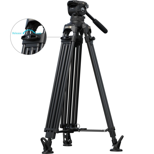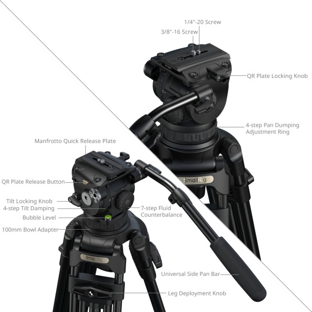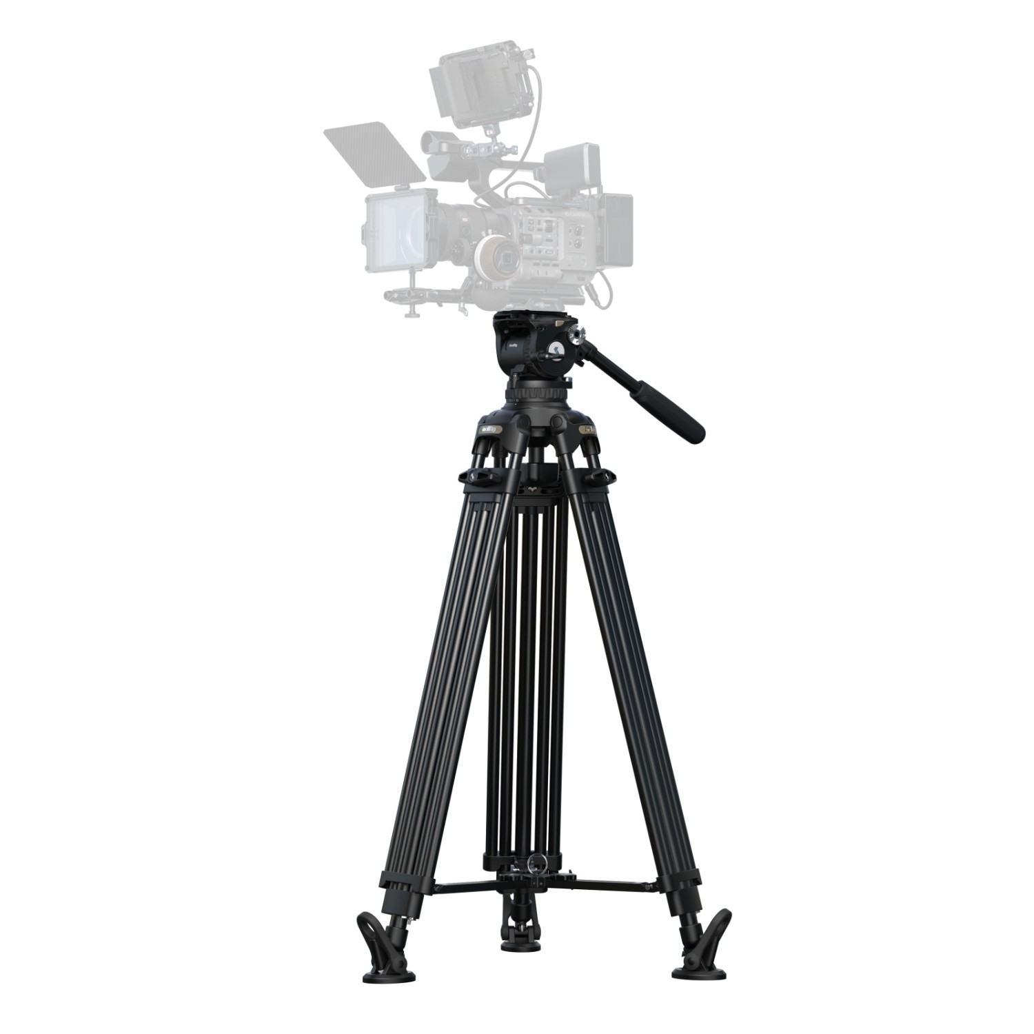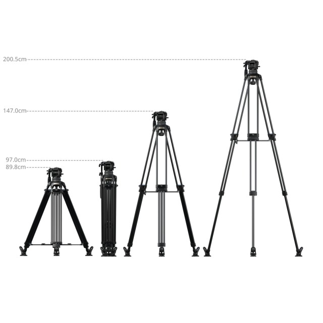 Das Stativ besteht aus Beinen aus Aluminiumlegierung (Ø 18 mm) in einer 3-teiligen 2-2-1-Segmentkonfiguration und einer standardmäßigen 100-mm-Schalenbasis und ist mit einem Fluidkopf mit 7-stufigem Gegengewicht und unabhängiger 4-stufiger Neigungs-/Schwenkdämpfungssteuerung ausgestattet. Der Gegengewichtsmechanismus unterstützt Lasten von 4 kg bis 10 kg (8,8 lb bis 22 lb), während der Kopf ein sicheres Betriebsgewicht von 15 kg (33,1 lb) und eine maximale Tragkraft von 17 kg (37,5 lb) bietet. Die Arbeitshöhe des Stativs reicht von 89,8 cm bis 200,5 cm (35,4 Zoll bis 78,9 Zoll) und gewährleistet hohe Laststabilität und gleichmäßige Bewegungsaufnahmen bei gleichzeitig hoher Aufnahmeposition.
