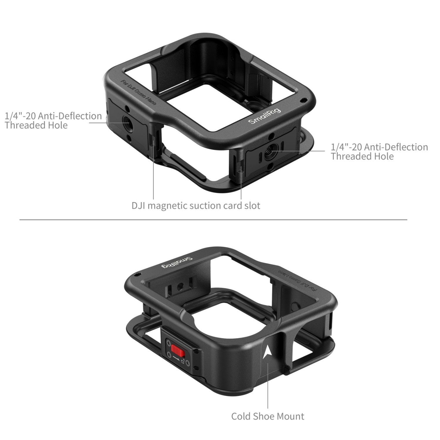 Darüber hinaus verfügt der Käfig über eine Kaltschuhhalterung und eine 1/4"-20-Gewindebohrung, sodass Benutzer problemlos externes Zubehör wie Mikrofone oder LED-Leuchten anbringen können. Diese Vielseitigkeit macht ihn ideal für Vlogging, Reiseaufnahmen und verschiedene Aufnahmeszenarien.