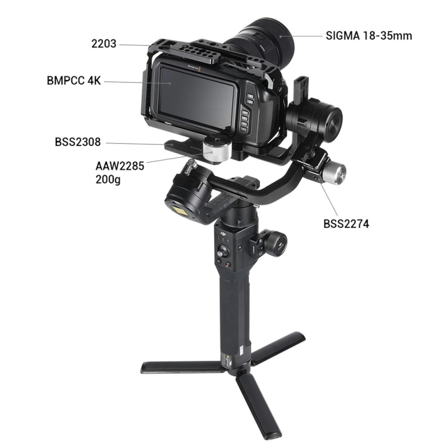 Diese Montageplatte ermöglicht es Ihnen, längere Objektive an Ihrer Kamera zu befestigen. Außerdem verfügt sie über eine 1/4"-20 Gewindebohrung an der Vorderseite, die für die Original-Objektivhalterung des Ronin S geeignet ist. Die optionale seitliche Gegengewichtsklammer 2274 ermöglicht es Ihnen, Ihr Gimbal als zweite Lösung auszubalancieren, insbesondere für die BMPCC 4K