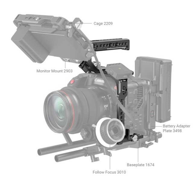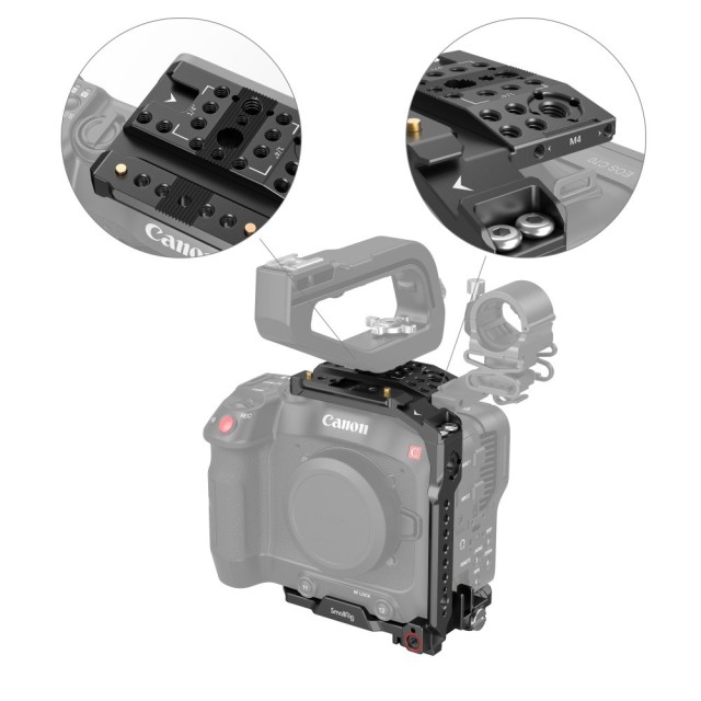 Das SmallRig Handheld Kit für die Canon EOS C70 3899 wurde entwickelt, um die Kamera zu schützen und Befestigungspunkte für Zubehör bereitzustellen und somit ein komfortables Handheld-Aufnahmeerlebnis zu ermöglichen. Es umfasst: eine Deckplatte, eine Seitenplatte, eine Grundplatte, eine abnehmbare verlängerte Grundplatte, einen oberen NATO-Griff, eine Kabelklemme usw., wobei der bequeme obere NATO-Griff die Kamerabewegung erleichtert und die Aufnahmen stabilisiert; die Deckplatte, die Grundplatte und die Seitenplatte können zu einem Halbkäfig zusammengebaut werden, der die ursprüngliche Griffeinheit und die Mikrofonhaltereinheit trägt. Die Basis des Halbkäfigs besteht aus einer Grundplatte und einer abnehmbaren erweiterten Grundplatte. Sie kann direkt auf DJI RS 2 / RSC 2 Stabilisatoren und Acra-Swiss Stativ montiert werden, indem man einfach die verlängerte Grundplatte entfernt. Das Kit wird außerdem mit einer HDMI-Kabelklemme geliefert, die eine versehentliche Unterbrechung des Signals verhindert und eine stabile Datenübertragung gewährleistet. Die 1/4"-20-Gewindebohrungen, 3/8"-16-Gewindebohrungen, Kaltlichthalterungen, ARRI 3/8"-16-Aufnahmebohrungen, NATO-Schienen usw. unterstützen den Seitenhandgriff 3260/2093/2427, den oberen Handgriff 2165/1638, den Magic Arm 2115/2071, die Monitorhalterung 3601/2903/2905, die Grundplatte mit 15-mm-Doppelstabklemme 1674, die Einzelstabklemme 3276 usw. Darüber hinaus ist ein Inbusschlüssel für eine einfache Demontage und Montage enthalten.