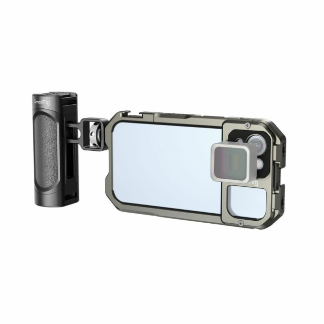 Das SmallRig Handheld Kit für iPhone 13 3735 ist ein perfektes Handy-Video-Rig für Vlogging, mobiles Filmen, Werbespots, etc. Das Kit wird mit einem speziell für das iPhone 13 entwickelten Käfig und einem seitlichen Griff für stabilere Handheld-Handyaufnahmen geliefert. Der Käfig verfügt über 1/4"-20 Anti-Twist-Gewindelöcher und kalte Schuhe, die Zubehör wie das Stativ BUT2429, das Mikrofon 3452 und die LED-Leuchte 3286 usw. unterstützen. Er unterstützt M-Mount-Objektive, um die Videoqualität zu verbessern. Das hohle Design ermöglicht den Zugang zu den iPhone-Tasten, Anschlüssen und dem Ultraweitwinkelobjektiv. Der Vollmetallkäfig mit eingebauten Unterlegscheiben verhindert Kratzer und reduziert Vibrationen. Der Käfig ermöglicht horizontale und vertikale Aufnahmen.