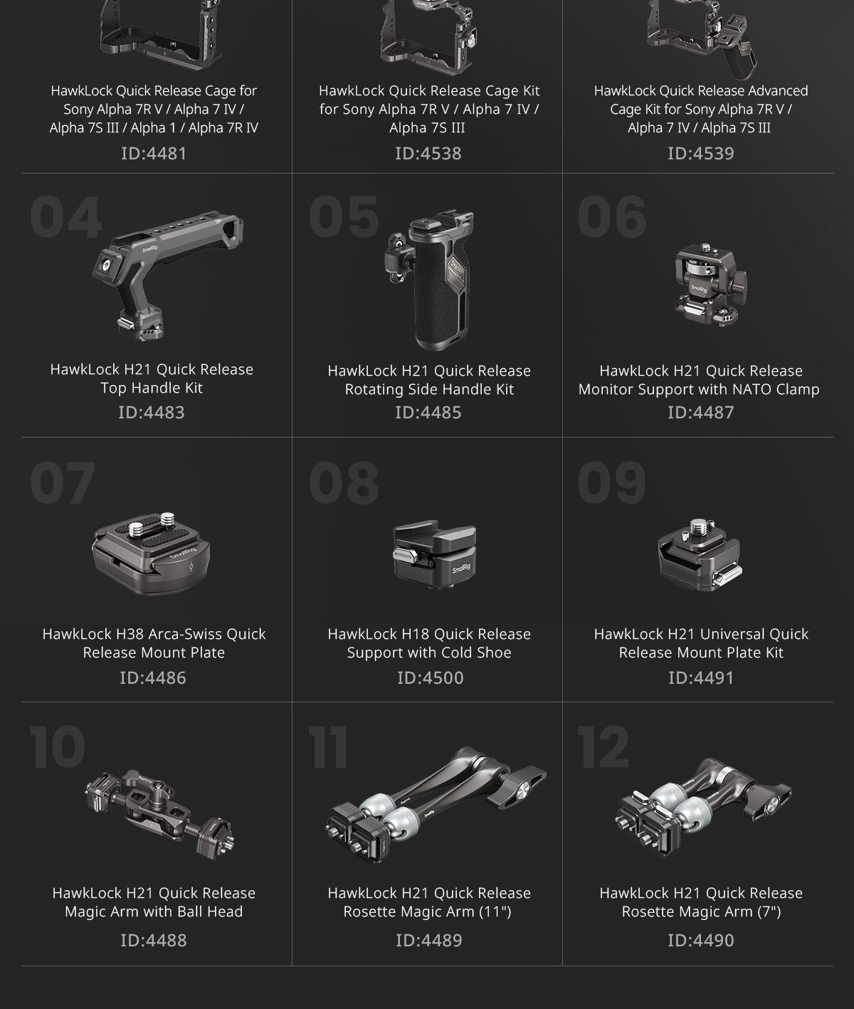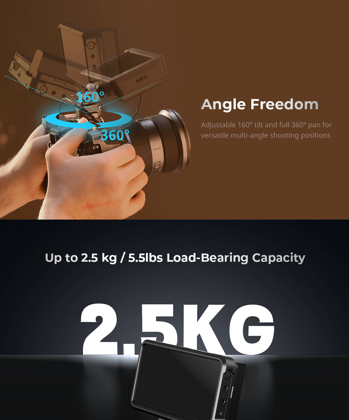 SmallRig HawkLock H21 Schnellwechsel-Monitorhalterung mit NATO-Klemme 4487 besteht aus einer Schnellwechsel-Monitorhalterung mit NATO-Klemme und einer NATO-Schnellwechselschiene. Drücken Sie den Knopf, um die Stifte aufzubördeln und die NATO-Schiene in die Rille zu schieben. Lassen Sie den Knopf los, um die NATO-Schiene sicher in der Monitorhalterung zu verriegeln, was die Konstruktion stabil und den Vorgang zeitsparend macht. Die 1/4"-20-Schraube an der Oberseite kann zur Befestigung eines Monitors, Mikrofons, Lichts oder, dank des eingebauten federbelasteten Fixierstifts, eines Ninja V / Ninja V+ Monitors verwendet werden, um ein Durchbiegen zu verhindern. Der Artikel unterstützt eine Neigungsverstellung von 160°, und die Festigkeit der Neigungsachse kann über den Drehknopf schnell eingestellt werden, um sich besser an Geräte mit unterschiedlichen Gewichten anzupassen. Das Gerät kann bis zu 2,5 kg / 5,5 lb halten, und die Dämpfung liegt nach 10.000 Kippvorgängen unter 20 %, was es langlebig macht. 360° schwenkbar mit horizontaler Achsenspannung, die mit dem mitgelieferten Sechskantschlüssel eingestellt werden kann.