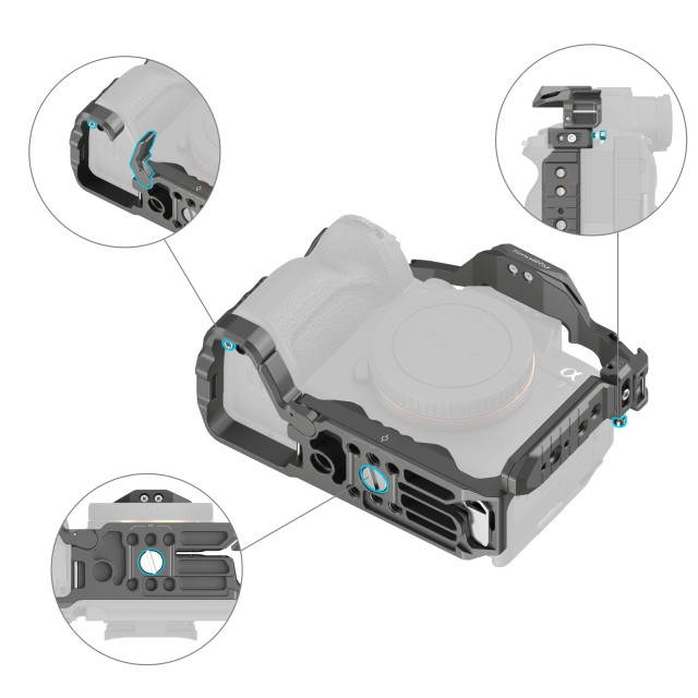 SmallRig HawkLock Quick Release Cage für Sony Alpha 7R V / Alpha 7 IV / Alpha 7S III / Alpha 1 / Alpha 7R IV 4481 wurde entwickelt, um Zubehörhalterungen zu bieten und die Kamera zu schützen. Die patentierte, selbst entwickelte Schnellverschluss-Struktur (HawkLock genannt) deckt Cold Shoes, NATO-Schiene und Arca Swiss ab, die mit HawkLock Öko-Zubehör verwendet wird, um eine solide und keine falsche Position zu realisieren, einen Druck zum Laden, Loslassen zum Verriegeln und die Effizienz der Demontage zu verbessern. Es verriegelt die Kamera über einen unteren Fixierstift, eine 1/4"-20 Schraube und eine M2,5 Schraube auf der linken Seite.