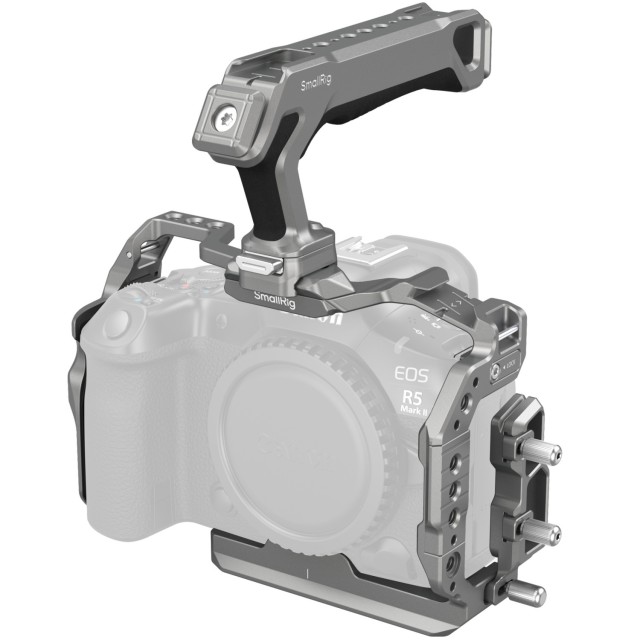 Das SmallRig HawkLock Quick Release Cage Kit für die Canon EOS R5 Mark II 5029 wurde entwickelt, um die Stabilität von Handheld-Aufnahmen, die Tragbarkeit und die Erweiterung von Zubehör zu verbessern. Das Kit umfasst einen Käfig, USB-C- und HDMI-Kabelklemmen und den HawkLock-Schnellspanngriff.