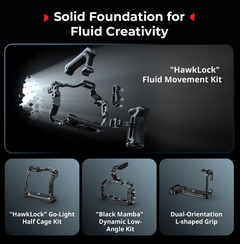 Das 3-Punkt-Verriegelungssystem sichert die Kamera mit einer 1/4"-20-Außengewindeschraube und zwei seitlichen Befestigungslöchern am Käfig und sorgt so für eine stabile und verdrehungsfreie Befestigung. Die QD-Buchse (Quick Detach) ermöglicht bei Bedarf ein schnelles und einfaches Entfernen des Käfigs. Zusätzlich gibt es eine Kaltschuhhalterung für die Befestigung von leichtem Zubehör und einen Riemenschlitz für einen Handgelenk- oder Schultergurt.