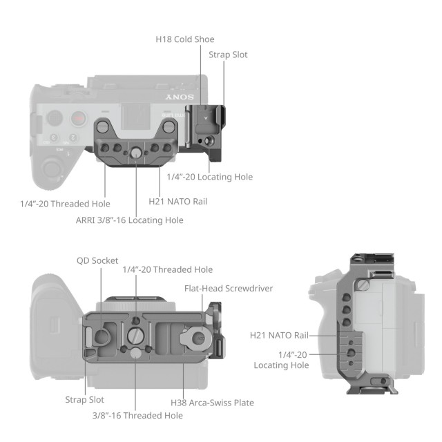 SmallRig HawkLock Quick Release Half Cage für Sony FX3 / FX30 4772 wurde entwickelt, um die Kamera zu schützen und Befestigungspunkte für Zubehör zu bieten. Der modulare Käfig besteht aus einer oberen Platte (NATO-Schiene) und einem L-förmigen Käfig. Die NATO-Schiene wird auf der Oberseite mit zwei 1/4"-20-Schrauben befestigt und abgenommen, um den originalen XLR-Topgriff installieren zu können; der L-förmige Käfig wird mit einer 1/4"-20-Schraube auf der linken Seite und an der Unterseite befestigt, um ein Verdrehen zu verhindern, und ist mit einem Polster gegen Kratzer versehen. Die patentierte, selbst entwickelte Schnellverschlussstruktur (HawkLock genannt) deckt den kalten Schuh, die NATO-Schiene und die Arca-Swiss-Platte ab.