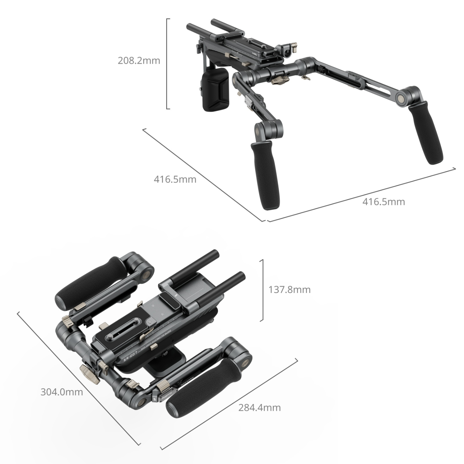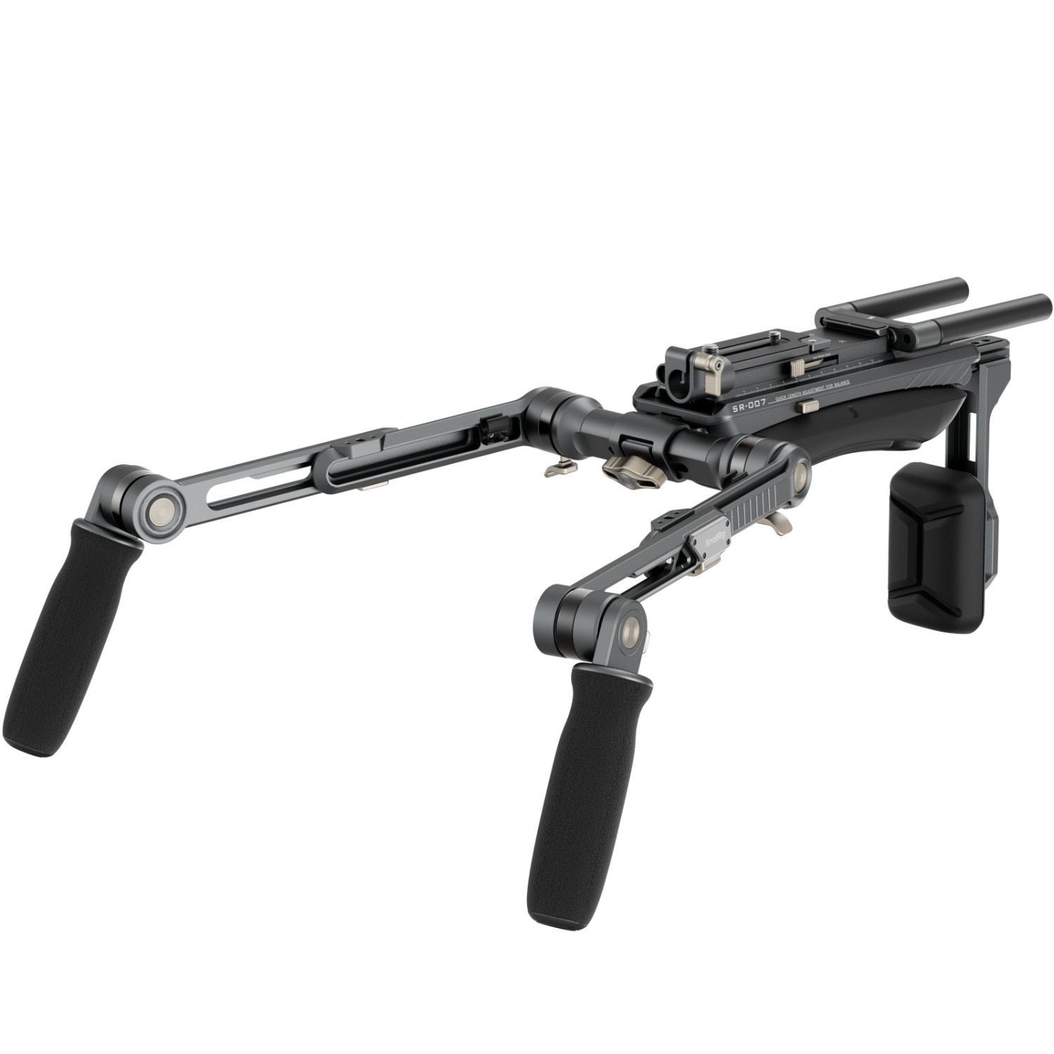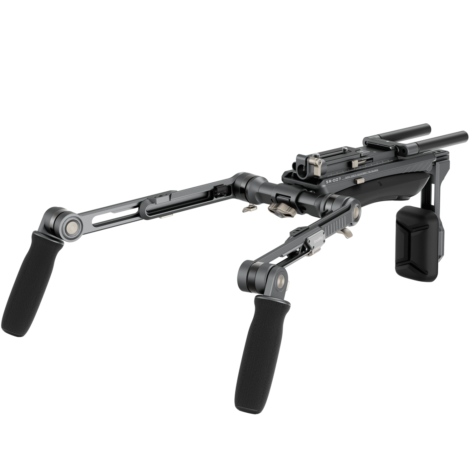 Das Schulter-Rig-Kit verfügt über ergonomische Griffe mit feiner Textur, die einen bequemen Griff bieten und eine 360°-Drehung ermöglichen. Die Verbindungswelle der Verlängerungsarme kann für eine optimale Kontrolle horizontal verstellt werden, während die stromlinienförmigen Schulter- und Rückenpolster einen hervorragenden Halt bieten. Das Rückenpolster lässt sich um bis zu 90° verstellen, so dass es in jedem Aufnahmewinkel gut sitzt, und die Schnellwechselplatte ermöglicht eine einfache Anpassung von vorne nach hinten für ein schnelles Gleichgewicht.