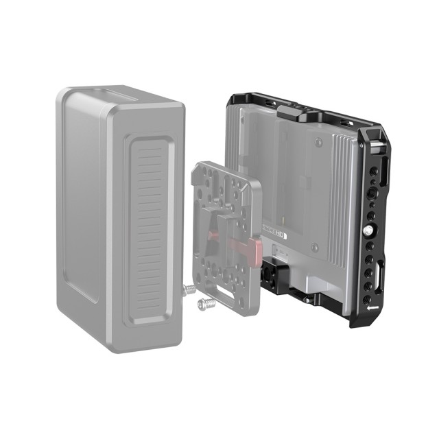 Der SmallRig Käfig mit Sonnenschutz für den SmallHD 702 Touch Monitor CMS2684 wurde entwickelt, um einen Rundumschutz und Zubehörhalterungen für den Monitor zu bieten. Der Käfig wird mit drei 1/4"-20 Schrauben am Monitor befestigt, je eine oben und unten und eine auf der Rückseite. Mehrere 1/4''-20 und ARRI 3/8''-16 Gewinde ermöglichen die Montage von Zubehör wie dem Magic Arm 2115, der Monitorhalterung BSE2348 und der Halterung für drahtlose Empfänger 2107. An der Unterseite befindet sich eine NATO-Schiene für NATO-kompatibles Zubehör, wie z. B. die Monitorhalterung BSE2385, mit der Sie Ihr Setup schnell lösen können. Die mitgelieferte Sonnenblende sorgt für Blendschutz bei Außenaufnahmen. Die Rückplatte ist mit der V-Lock-Batteriehalterung 1846 zur Befestigung einer V-Mount-Batterie kompatibel. Im Inneren befinden sich mehrere Gummipuffer, um den Monitor vor Kratzern zu schützen.